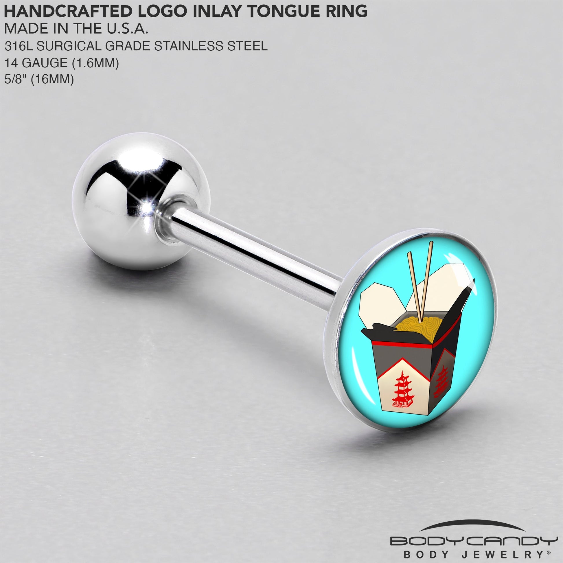 The only thing tastier than Chinese food for dinner is the Chinese food on this 14 gauge tongue jewelry. It is made with a 5/8 inch 316L surgical grade stainless steel straight barbell with a 5mm bottom ball end. It features a blue disc with a takeout food carton on it. The carton is embellished with a red pagoda and has a pair of chopsticks sticking out of the top. Live deliciously when you are rocking this tasty tongue piercing jewelry.