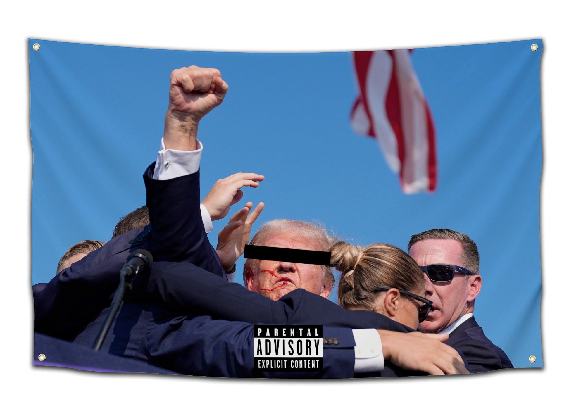 A graphic remix of the 2024 rally moment — complete with blood, shades, censorship bars, and a Parental Advisory label — this one’s for chaos enjoyers, ironic patriots, and the meme-fueled fringe.