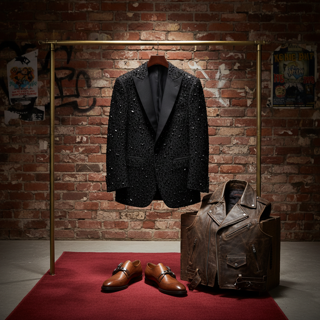 This is formal rebellion. Crystal tuxedo for red carpets, luxury Oxfords for class, and a leather vest for when the tie comes off.