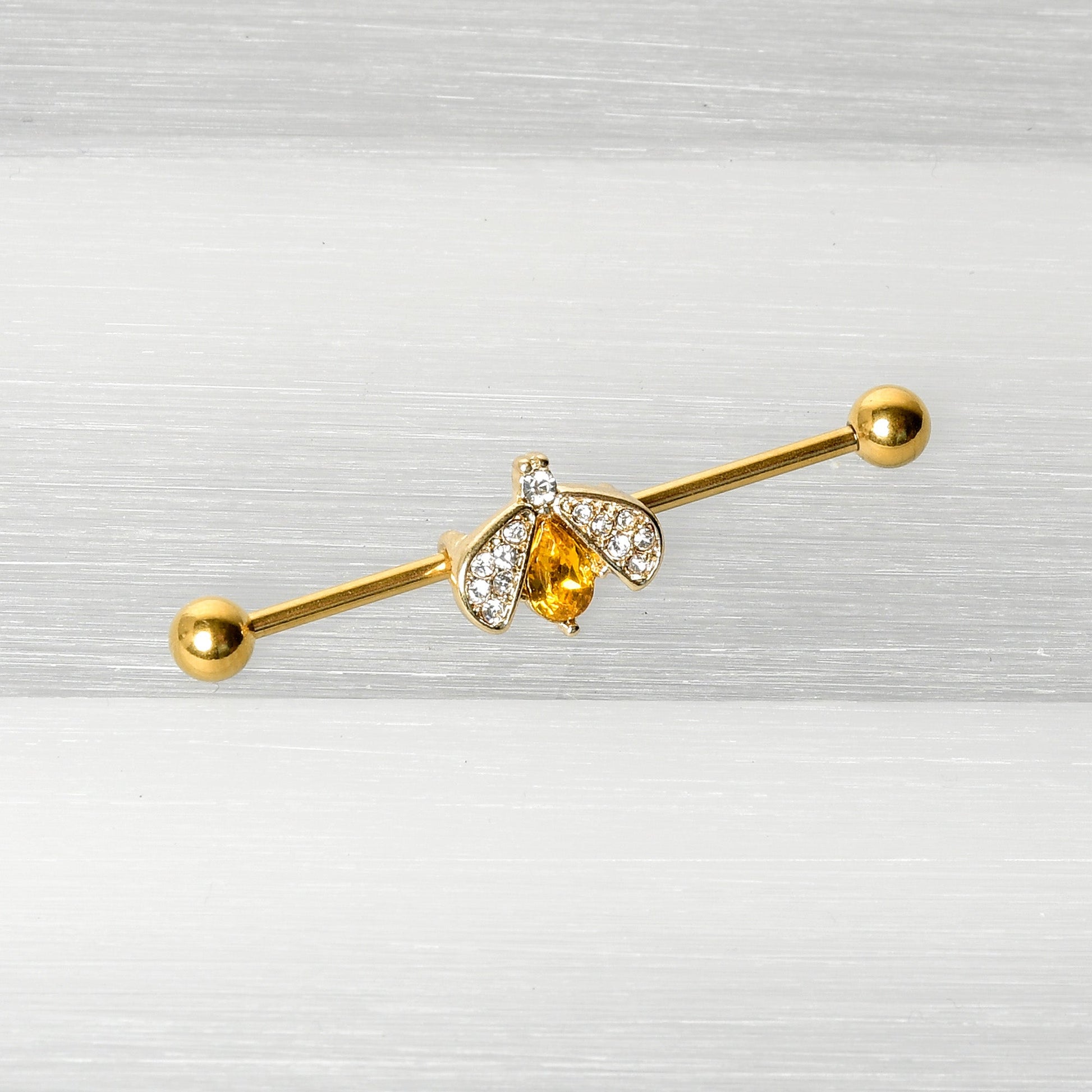 14G Clear Yellow Gem Gold Tone Style Bug Industrial Barbell 38mm
