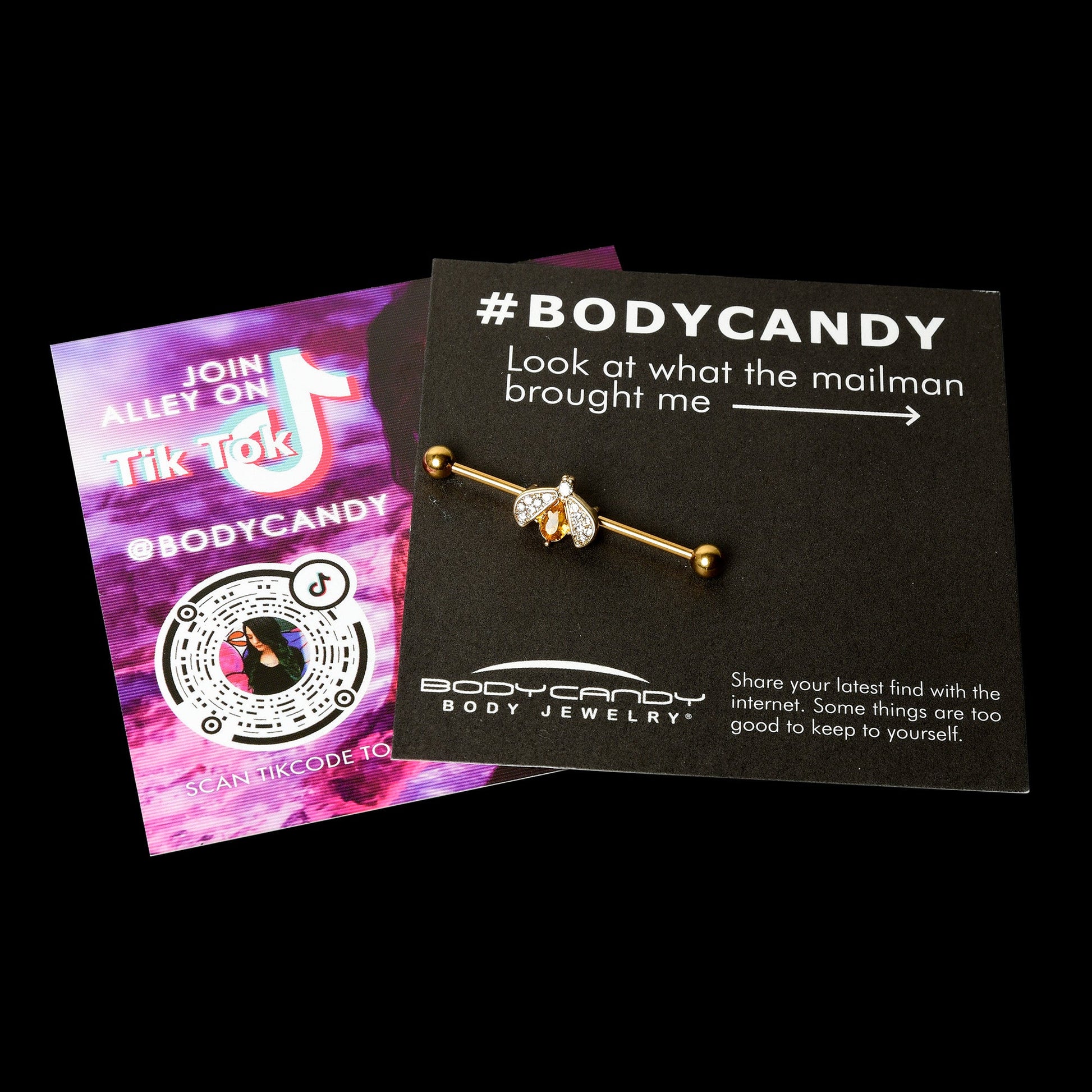 Get ready to catch the fashion bug with this stylish 14 gauge helix barbell! It's made with a 1 1/2" gold tone PVD over 316L surgical grade stainless steel straight barbell with 5mm ball ends. It features an insect charm, with the insect's head composed of a single clear gem and the wings paved with matching clear gems. The insect also features a yellow gem body and you can even slide it up and down the length of the barbell for the perfect look. Don't let boring jewelry bug you when you're rocking this stylish helix barbell!