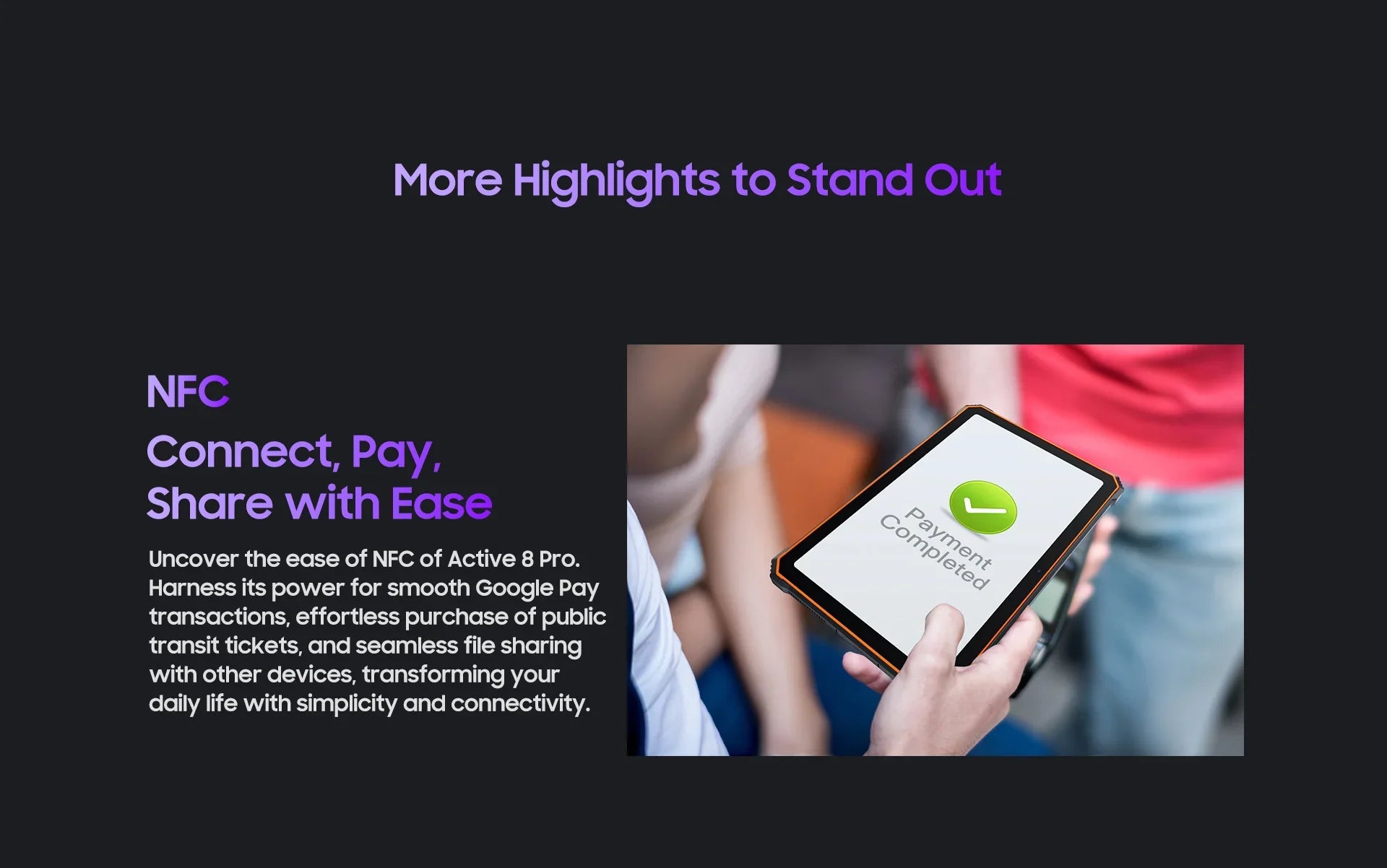 Uncover the ease of NFCof Active 8 Pro. Harness its power for smooth Google Pay transactions, effortless purchase of public transit tickets, and seamless file sharing with other devices, transforming your daily life with simplicity and connectivity.