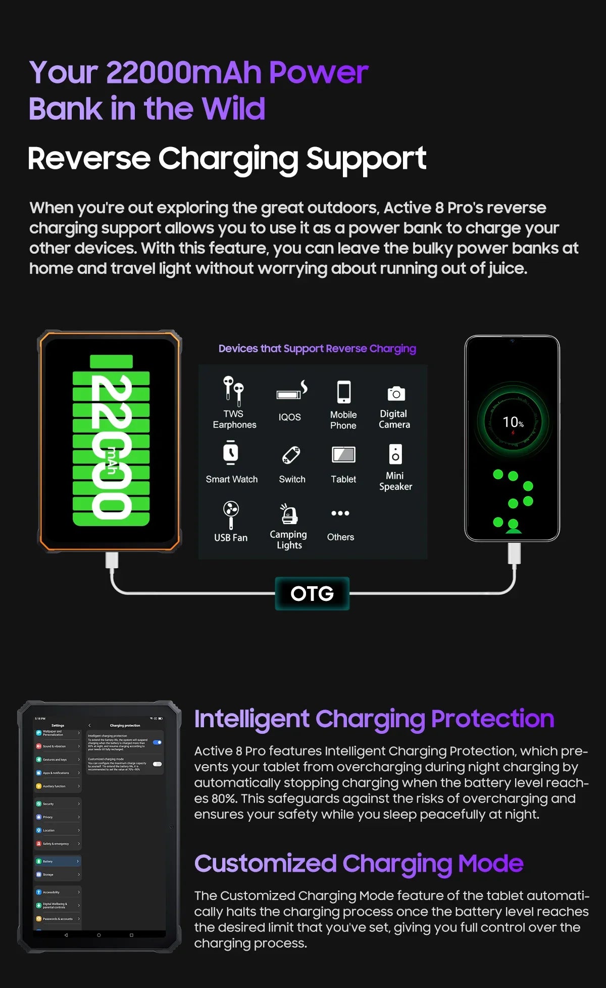 Active 8Profeatures Intelligent Charging Protection, which prevents your tabletfrom overcharging during night charging by automatically stopping charging when the battery level reaches 80%. This safeguards against the risks of overcharging and ensures your safety while you sleep peacefully at night.