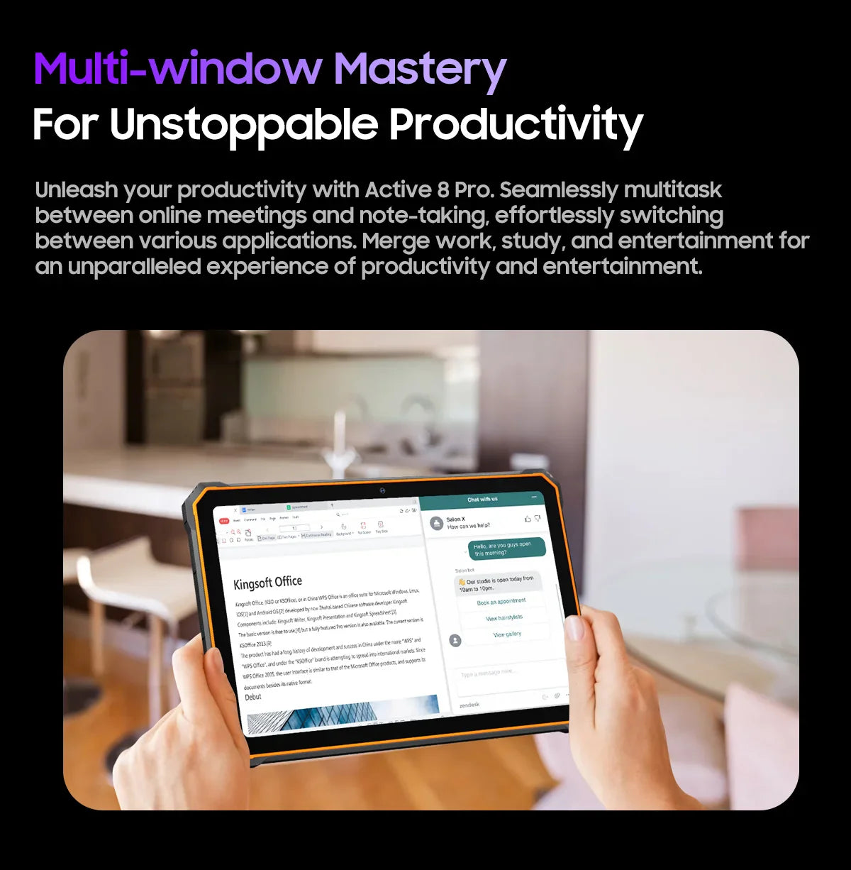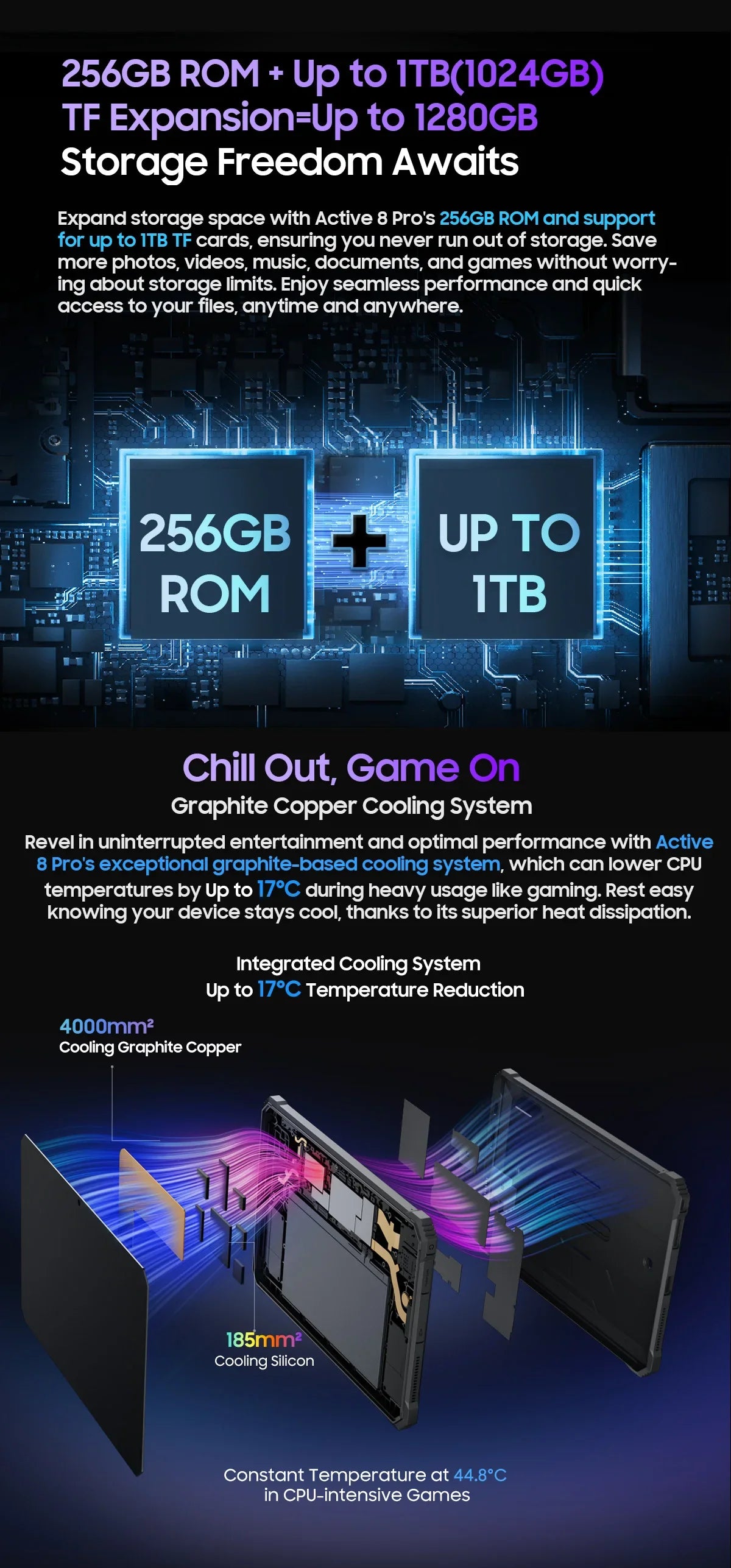 Active 8 Pro is equipped with a dual-SIM slot that allows you to stay connected with your loved ones at all times. You can insert two 4G SIM cards or a TF card of up to 1TB, which enables you to access the Internet even in areas without WiFi.