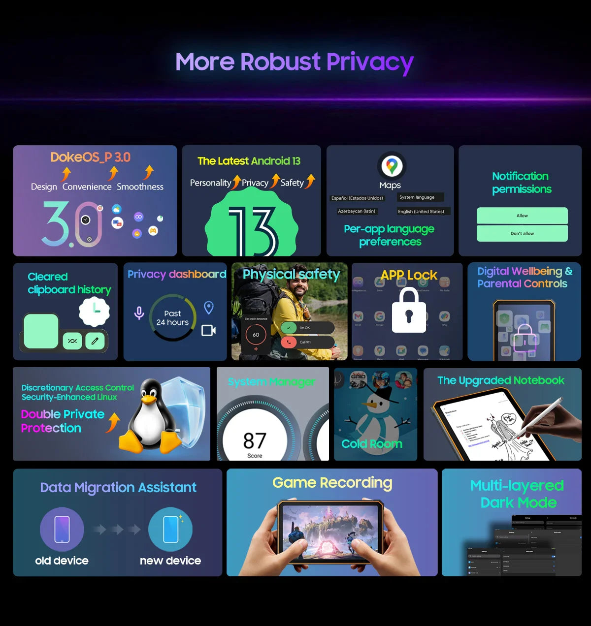 The new DokeOS_P 3.0 UI system based on Android 13, logically allocates system resources and makes efficient use of memory space. Equipped with a new octa-core processor, and comprehensively improved higher running speeds, you can enjoy a smoother user experience.