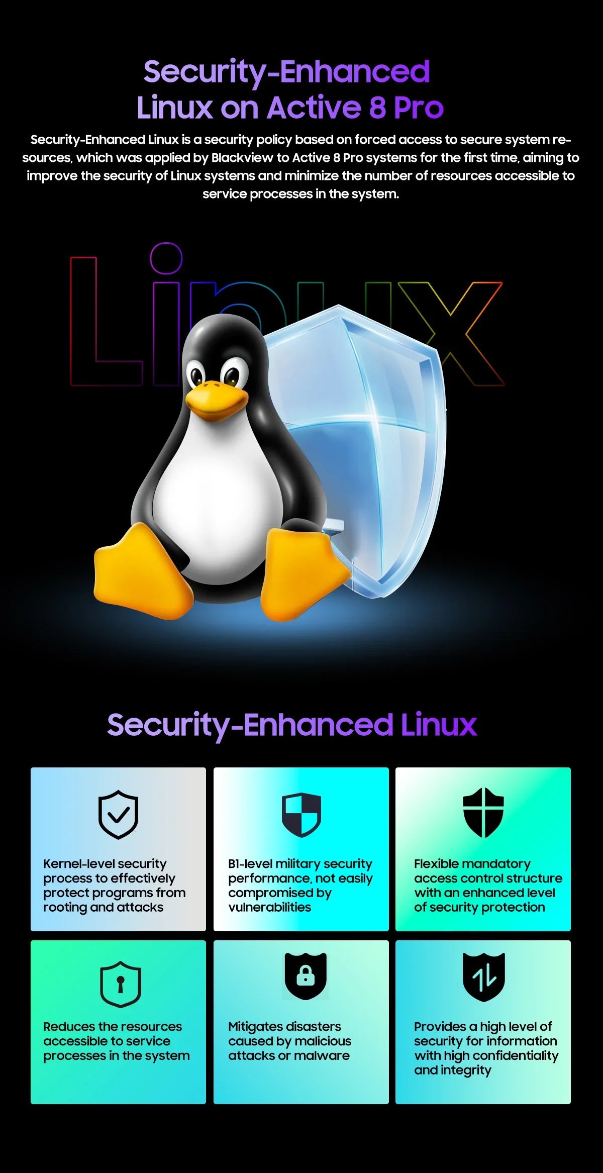 Security-Enhanced Linux is a security policy based on forced access to secure system resources, which was applied by Blackview to Active 8 Pro systems for the first time, aiming to improve the security of Linux systems and minimize the number of resources accessible to service processes in the system.
