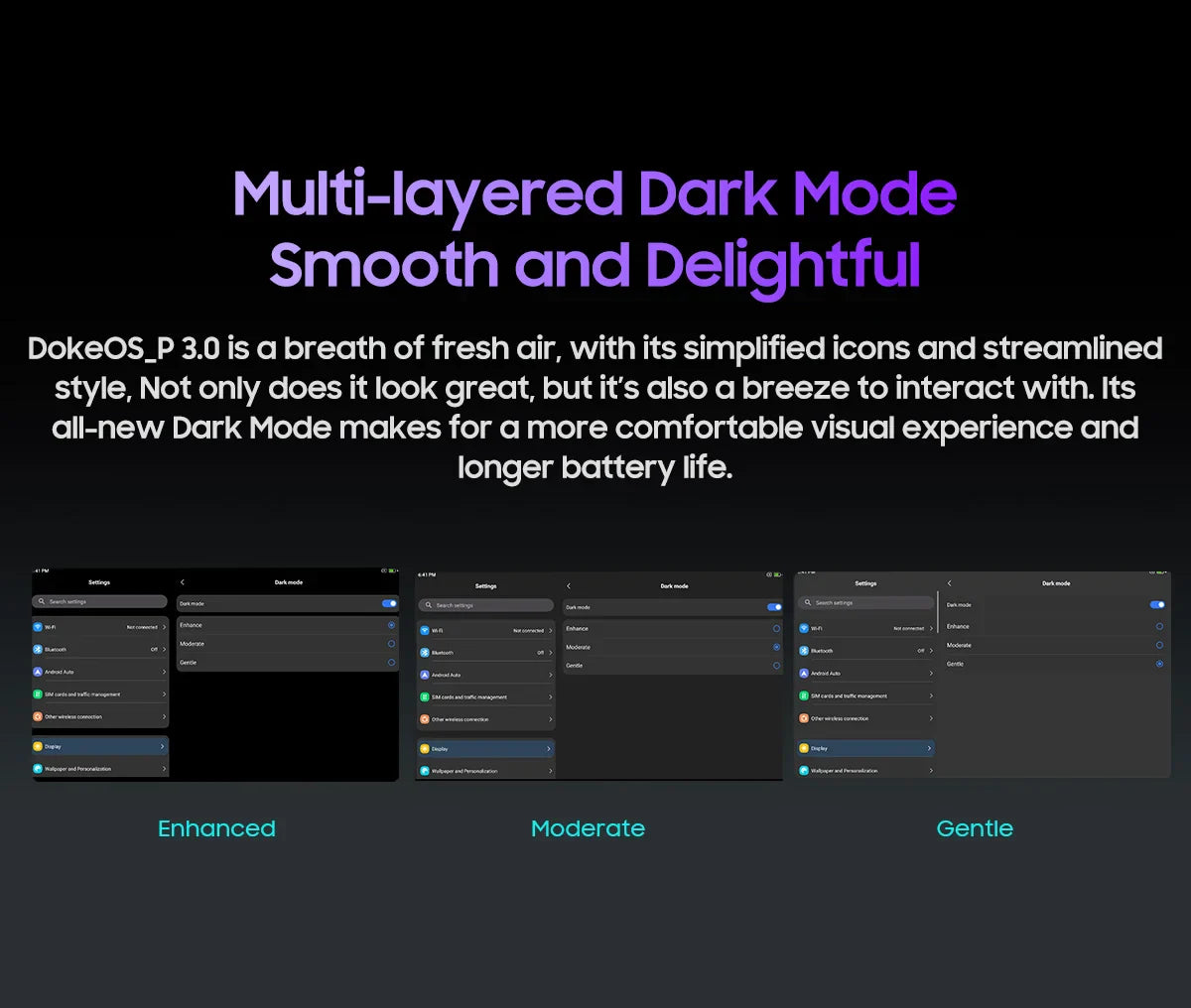 DokeOS_P 3.0 is a breath of fresh air, with its simplified icons and streamlined style, Not only does it look great, but it's also a breeze to interact with. Its all-new Dark Mode makes for a more comfortable visual experience and longer battery life.
