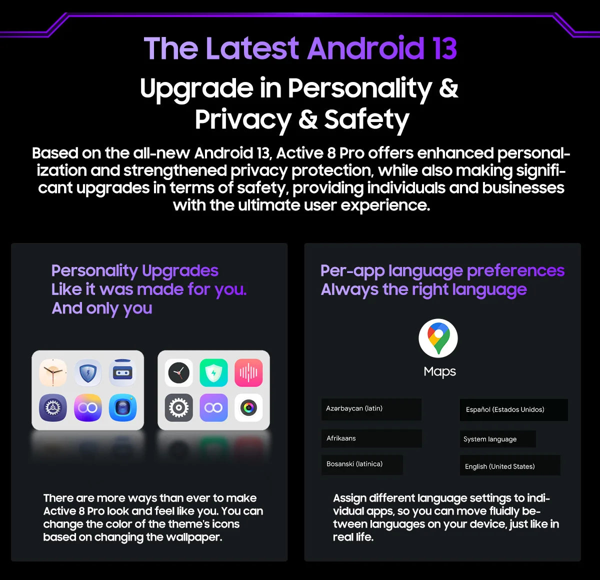 Based on the all-new Android 13, Active 8 Pro offers enhanced personalization and strengthened privacy protection, while also making significant upgrades in terms of safety, providing individuals and businesses with the ultimate user experience.