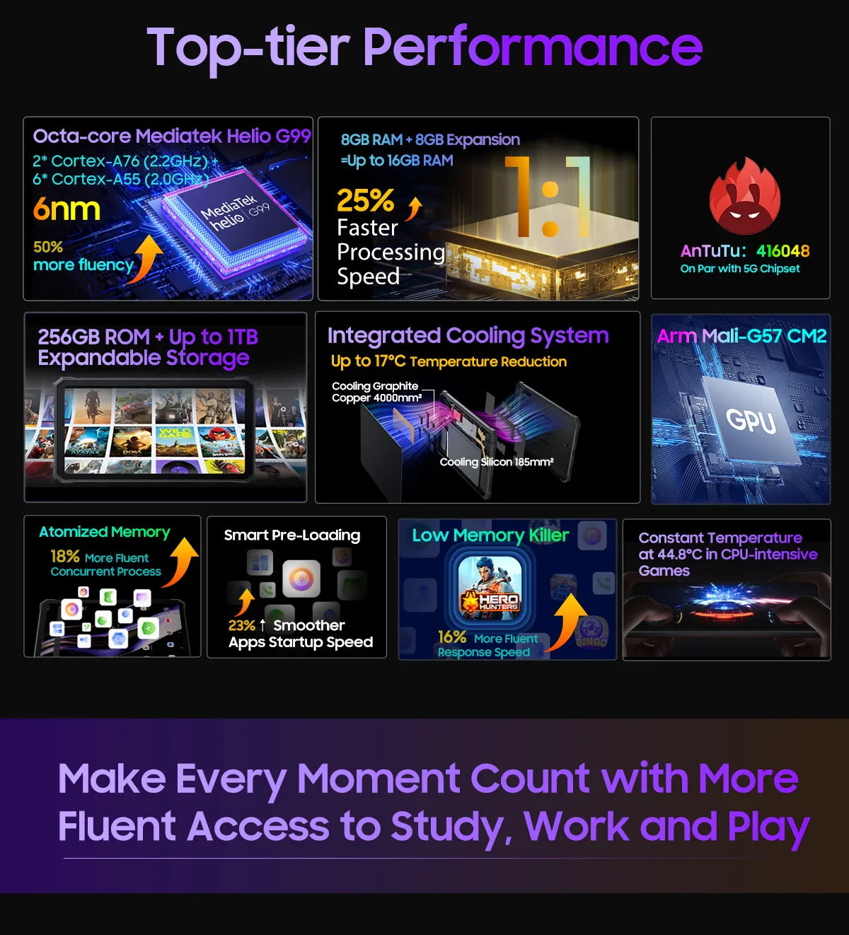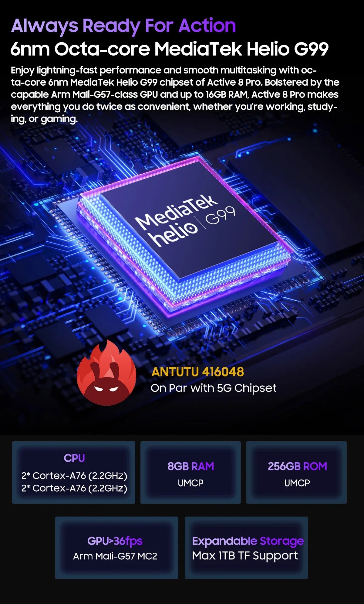 Enjoy lightning-fast performance and smooth multitasking with the octa-core 6nm MediaTek Helio G99 chipset of Active 8 Pro. Bolstered by the capable Arm Mali-G57-class GPU and up to 16GB RAM, Active 8 Pro makes everything you do twice as convenient, whether you're working, studying or gaming.