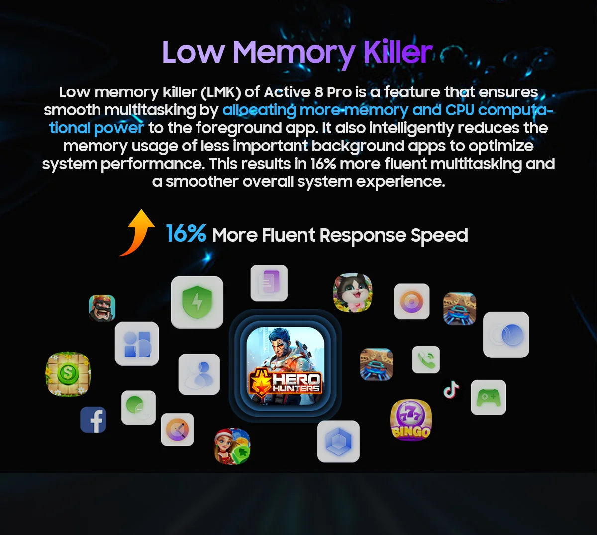 The low memory killer (LMK)of Active 8 Pro is a feature that ensures smooth multitasking by allocating more memory and CPU computational power to the foreground app. It also intelligently reduces the memory usage of less important background apps to optimize system performance. This results in 16% more fluent multitasking and a smoother overall system experience.
