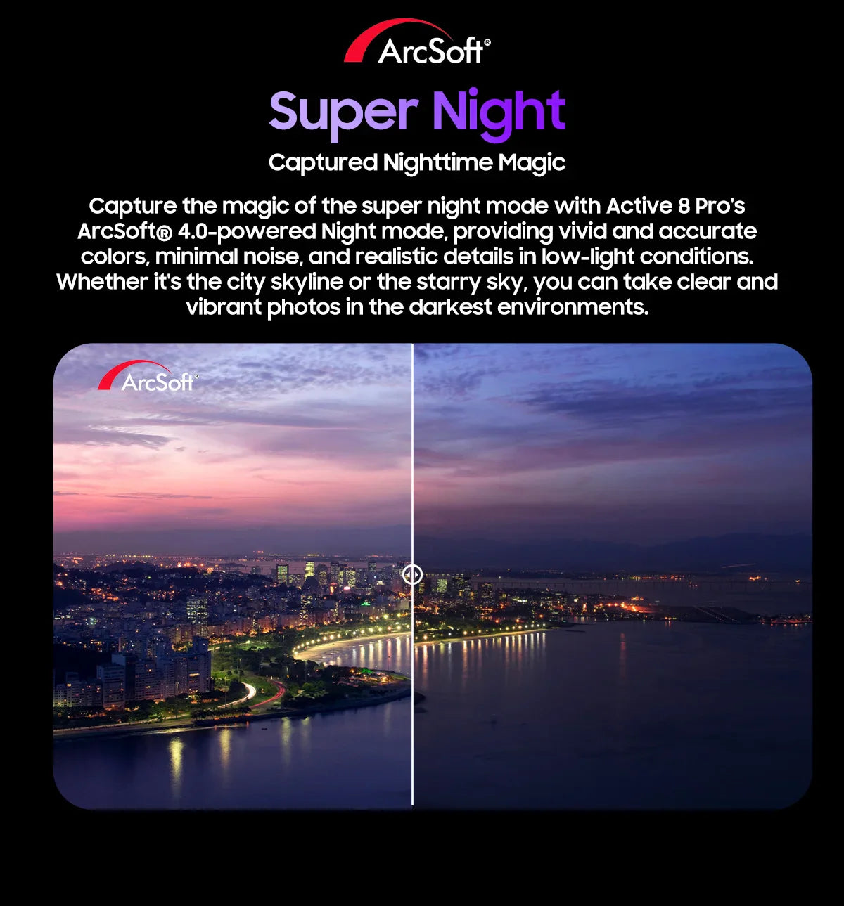 Capture the magic of the super night mode with Active 8 Pro's ArcSoft®4.0-powered Night mode, providing vivid and accurate colors, minimal noise, and realistic details in low-light conditions. You can take clear and vibrant photos in the darkest environments, Whether it's the city skyline or the starry sky.