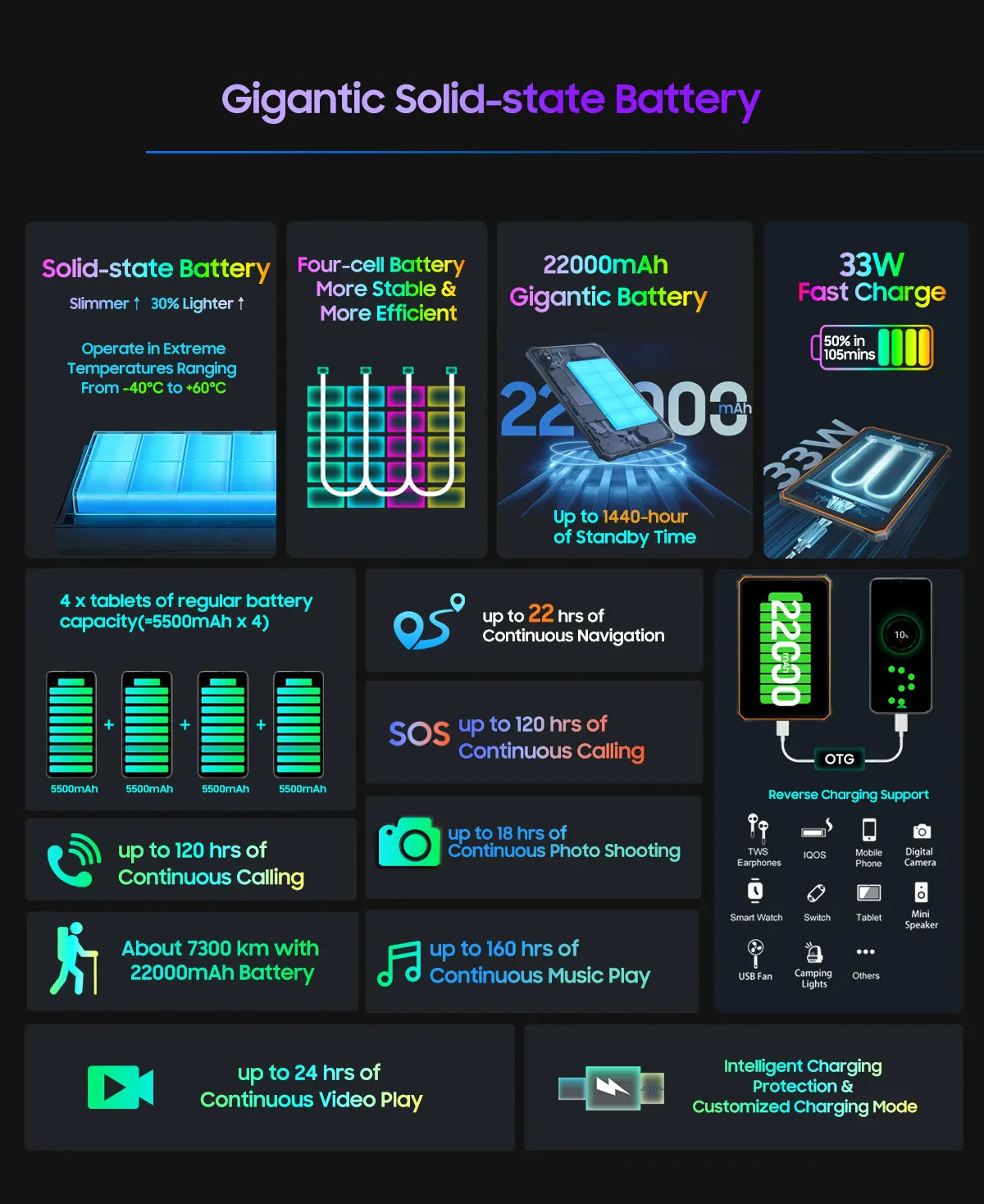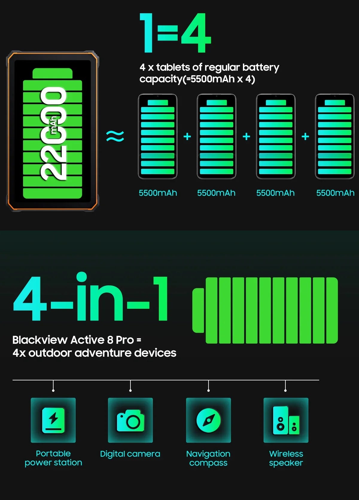 Say goodbye to battery anxiety with Blackview Active 8 Pro's gigantic 22,000mAh four-cell solid-state battery. With up to 1,440hours of standby time, you can explore the outdoors for months without worrying about running out of juice. Keep your journey and work going strong with uninterrupted productivity and entertainment.