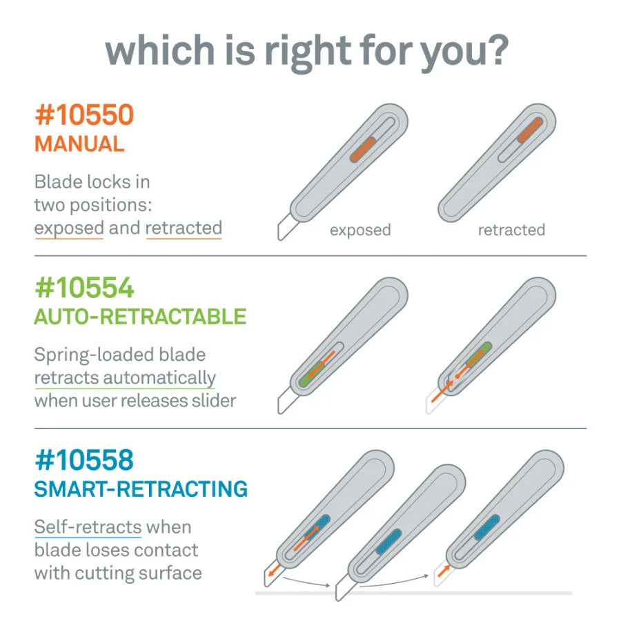 - An easy-grip slider allows you to manually retract the blade when not in use