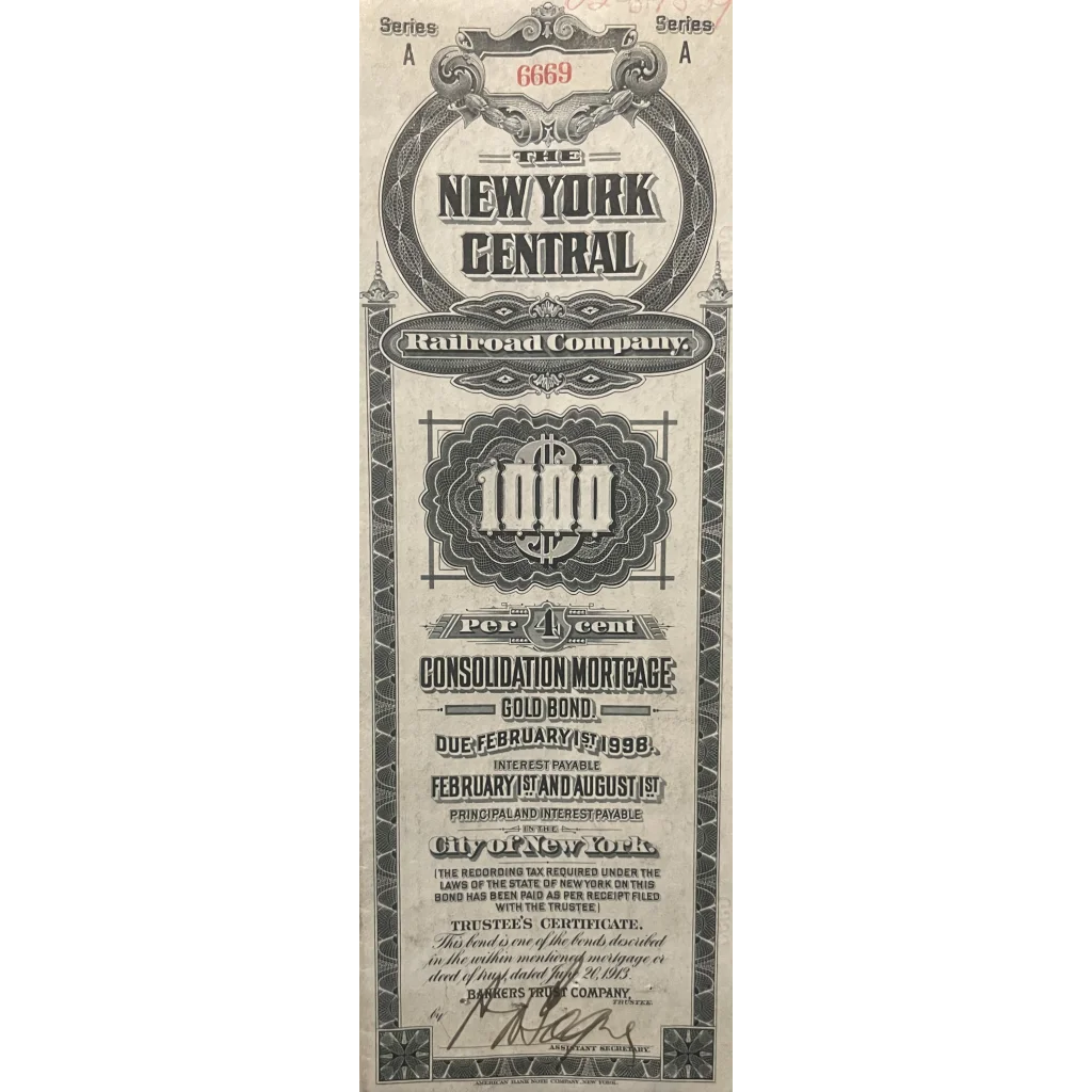 Hold on to your seats, history buffs and collectors! This is your once-in-a-lifetime opportunity to own a genuine piece of American railroad history! Up for grabs is an extraordinary and authentic Antique 1913 The New York Central Railroad Company Gold Bond Certificate. This isn't just any old document – it's a tangible connection to the golden age of rail travel, a time when iron horses thundered across the nation, connecting cities and shaping the American landscape.
