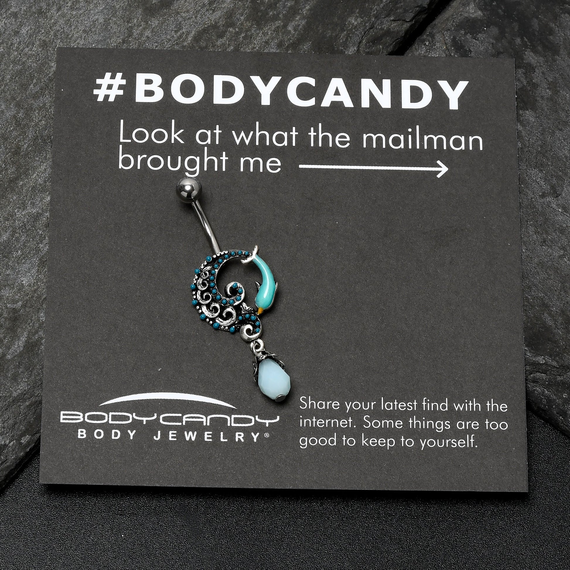 You will fall in love with this 14 gauge navel ring faster than lightning. It is made with a 3/8 inch 316L surgical grade stainless steel curved barbell with a 5mm top ball end. The bottom end features a dolphin charm, inlaid in pale blue. The dolphin is leaping into an elegantly curled wave, which is embellished with blue and and black textured inlay. Dangling beneath it is a pale blue bauble for added movement and color. Ride a wave of style with this darling dolphin belly piercing ring.
