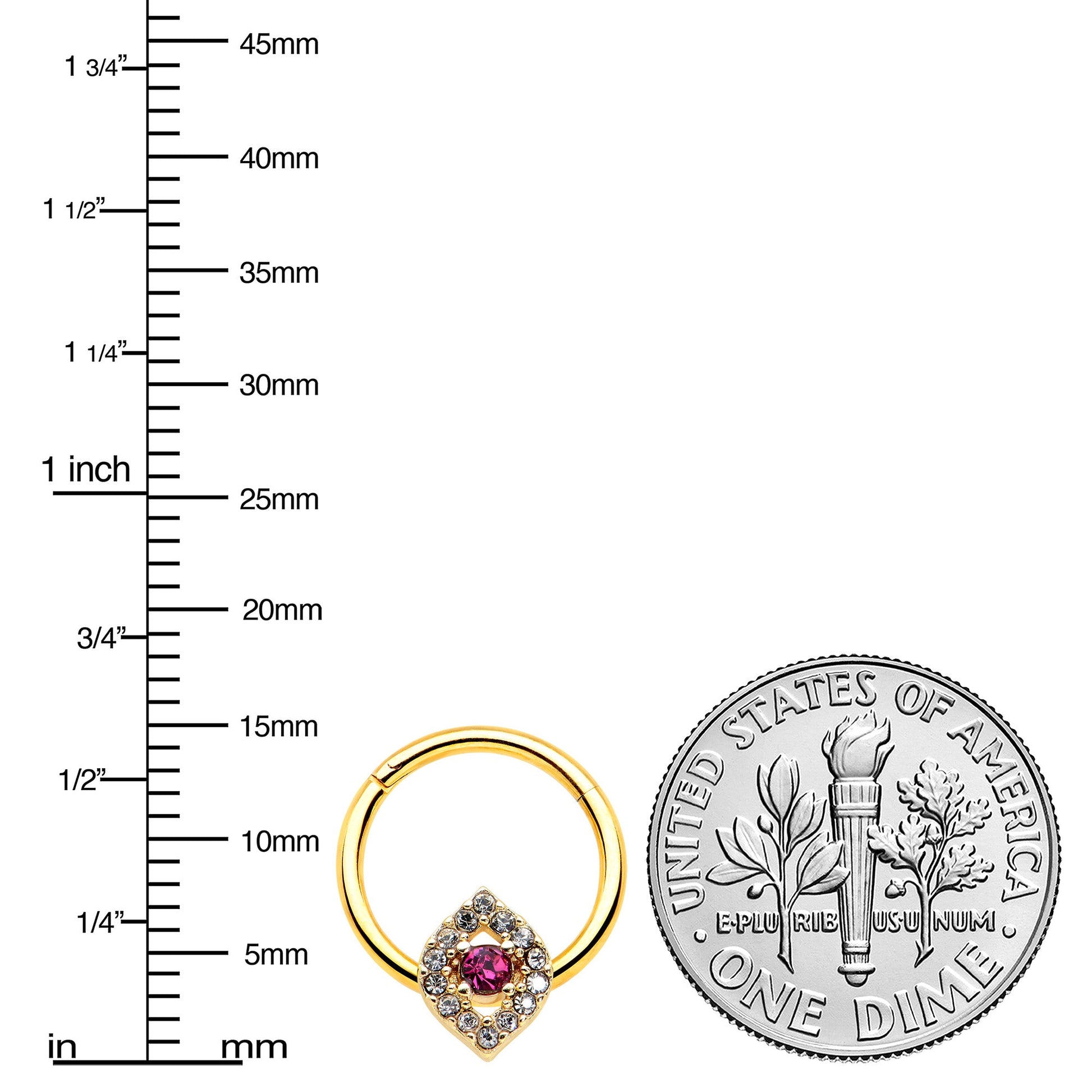 Keep your eyes open and you'll spot amazing things - like this 16 gauge septum ring! It's made with a 10mm gold tone PVD over 316L surgical grade stainless steel hinged circular ring. It features an eye charm, with the rim paved in clear gems. The center of the eye is a large pink gem for a striking splash of color. It also features a non-removable, hinged segment that makes insertion and removal a breeze and you can rock it in multiple piercings including tragus, helix, and daith. You'll have all eyes on you with this eye-opening cartilage piercing ring!Specifications