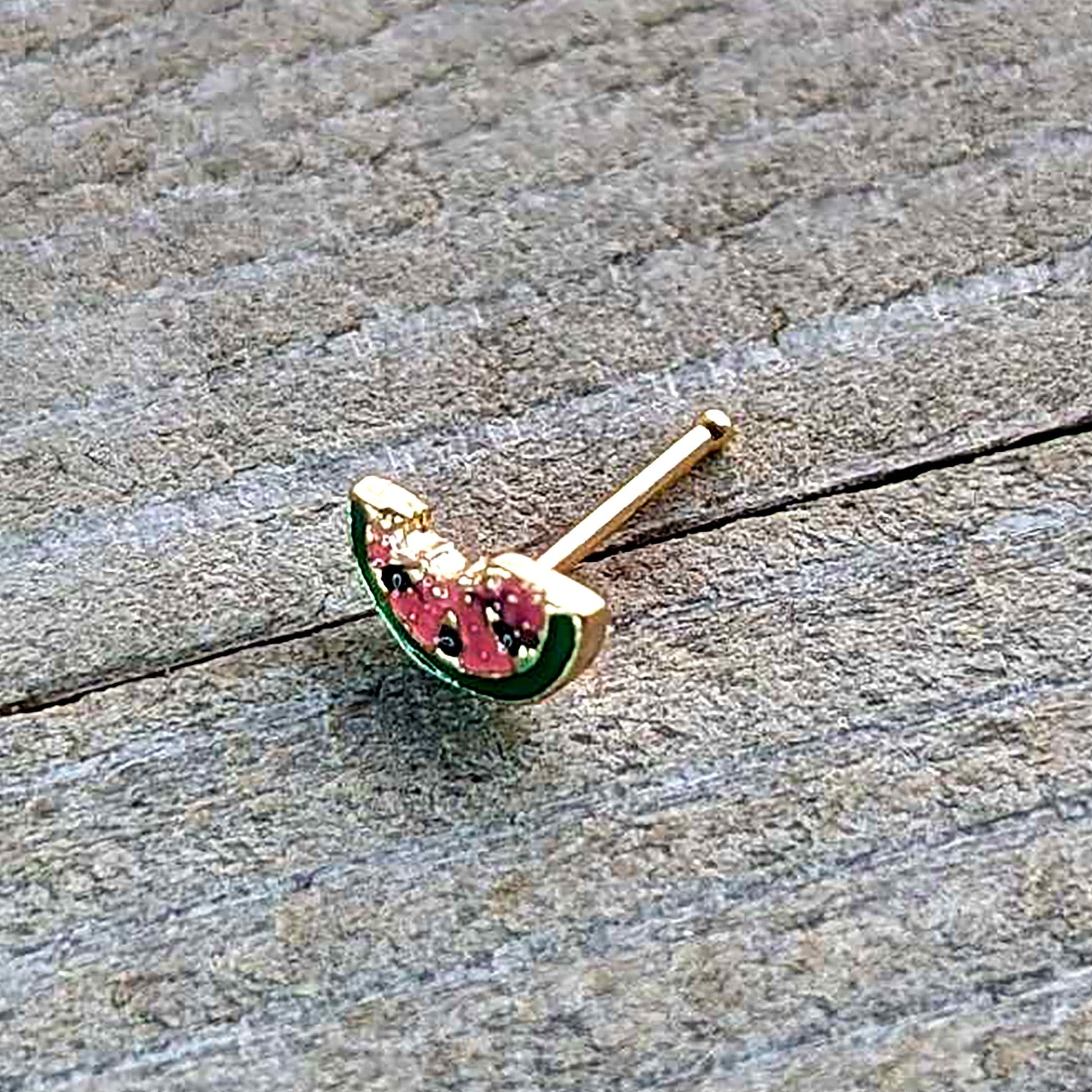 Take a bite of style with this tasty 20 gauge nostril ring. It is made with a 6mm gold tone PVD over 316L surgical grade stainless steel straight post. It features a watermelon slice charm, inlaid in red and green with black seed embellishments. The tasty fruit even has a bite already taken out. You too will find this yummy melon nose piercing ring irresistible.
