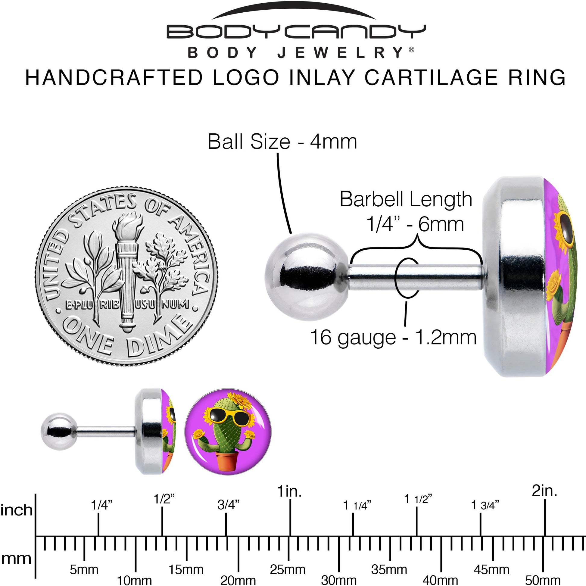 Some folks just bloom in the sunshine, like the cactus on this 16 gauge tragus stud. It is made with a 6mm durable 316L surgical grade stainless steel straight barbell with a 4mm ball end. It features a purple disc with a potted cactus plant on it. The stylish succulent is blooming with yellow flowers and rocking a pair of yellow sunglasses to match and you can rock it in multiple piercings including tragus, helix, and some conch piercings. Soak up some sunny style with the stylish cactus on this cartilage piercing jewelry.