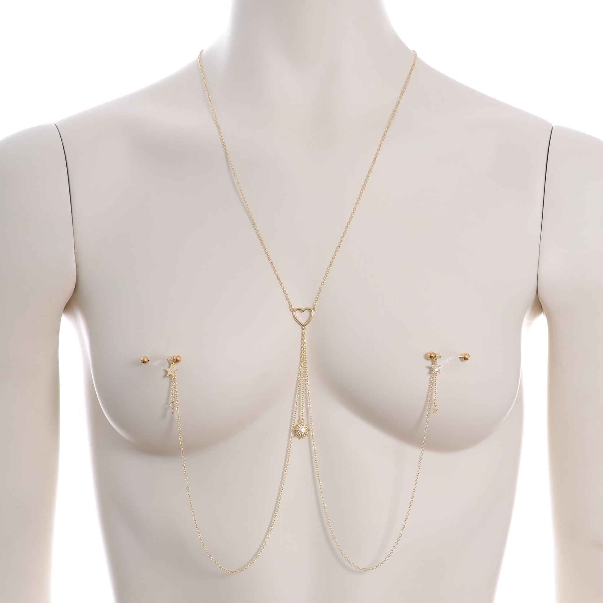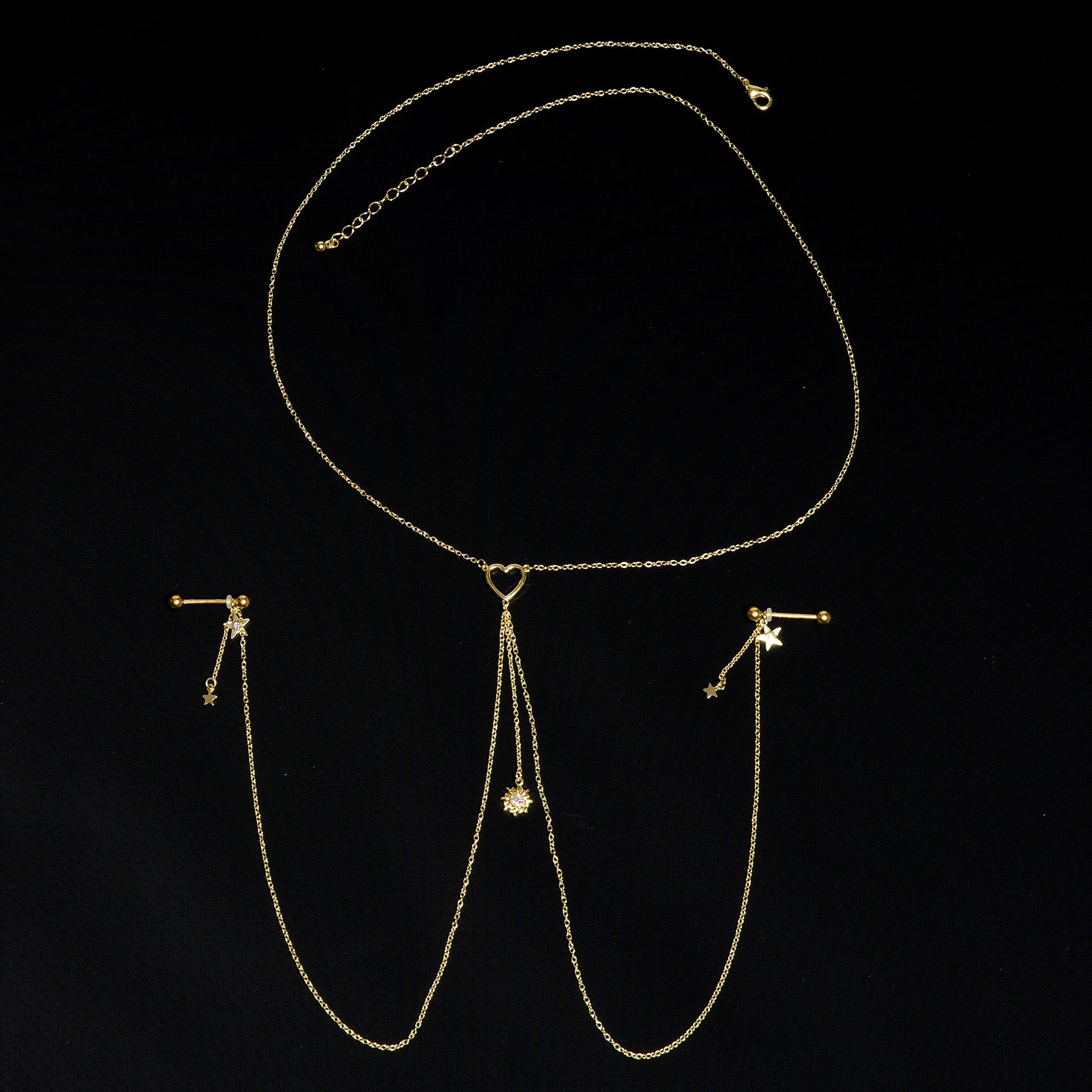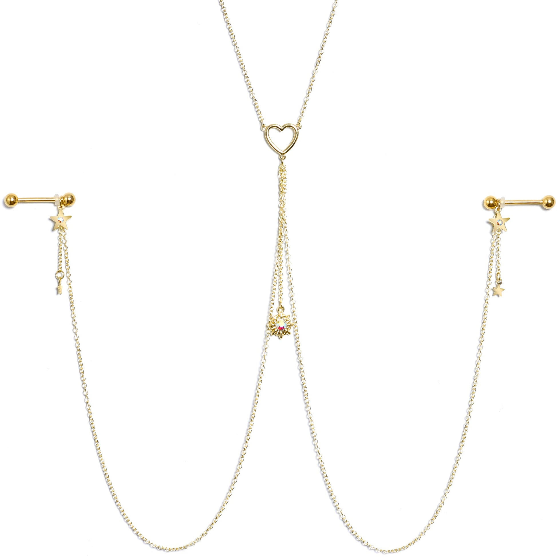 14G 5/8 Aurora Gem Gold Tone Sun Heart Star Nipple Chain Necklace