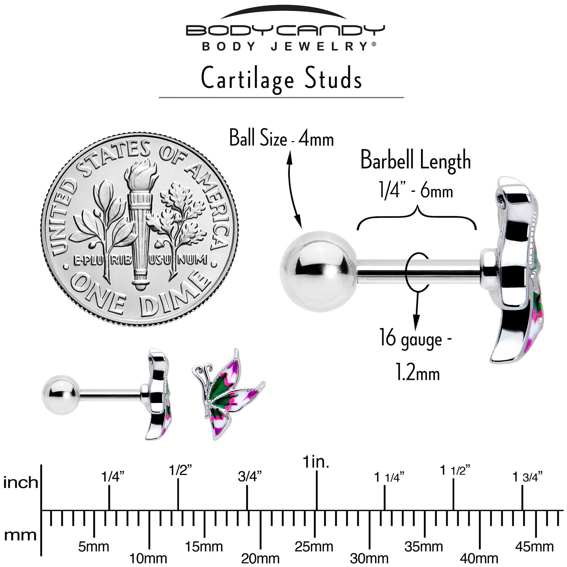 You won't be keeping a low profile when you are rocking this 16 gauge tragus stud. It is made with a 6mm durable 316L surgical grade stainless steel straight barbell with a 4mm ball end. It features a purple, pink, green, and white inlaid butterfly charm, seen in profile to give you the best possible view of the wings. It also features simple detailing and you can even rock it in multiple piercings including tragus, helix and some conch piercings. You will be looking picture perfect with this delightful butterfly cartilage piercing jewelry.