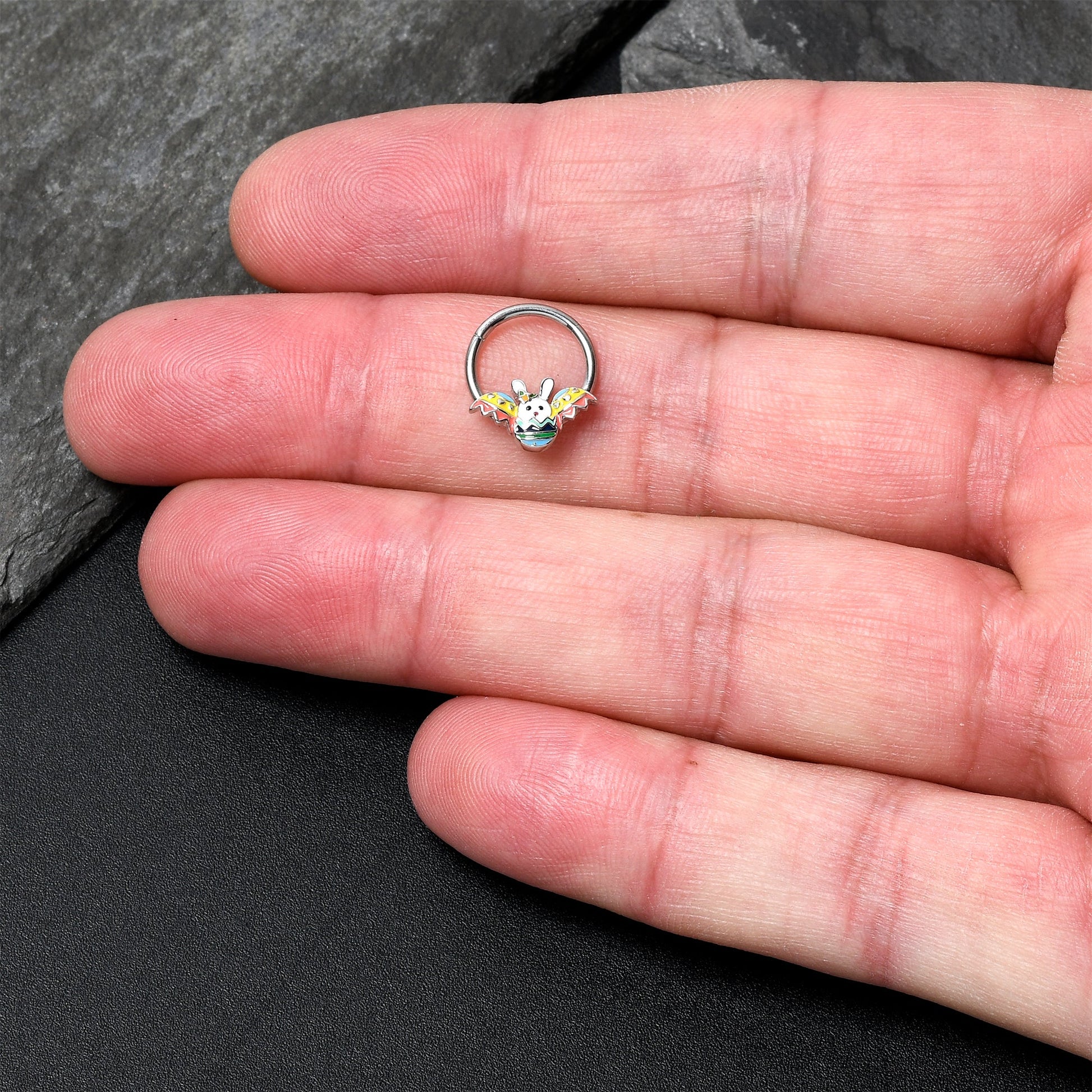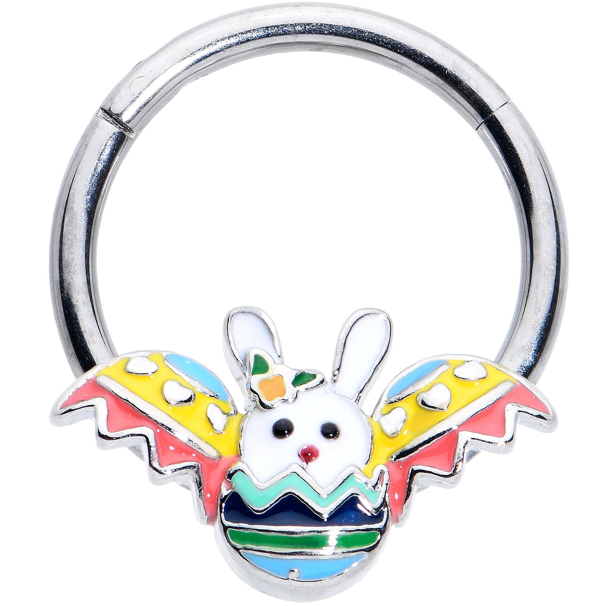 Hatch a new look with this 16 gauge septum ring. It is made with a 10mm 316L surgical grade stainless steel hinged circular ring. It features a bunny rabbit charm, inlaid in white with simple features. The bunny has a green inlay ornament on one ear and is hatching from a green, blue, and black inlaid Easter egg for a sweetly colorful appearance. The bunny is also flanked between a pair of pink and yellow egg shells and features a non-removable, hinged that makes insertion and removal a breeze. You can even rock this rabbit in multiple piercings including tragus, helix, and some daith piercings. You will want to hop to it and snatch up this adorable Easter rabbit cartilage piercing ring.