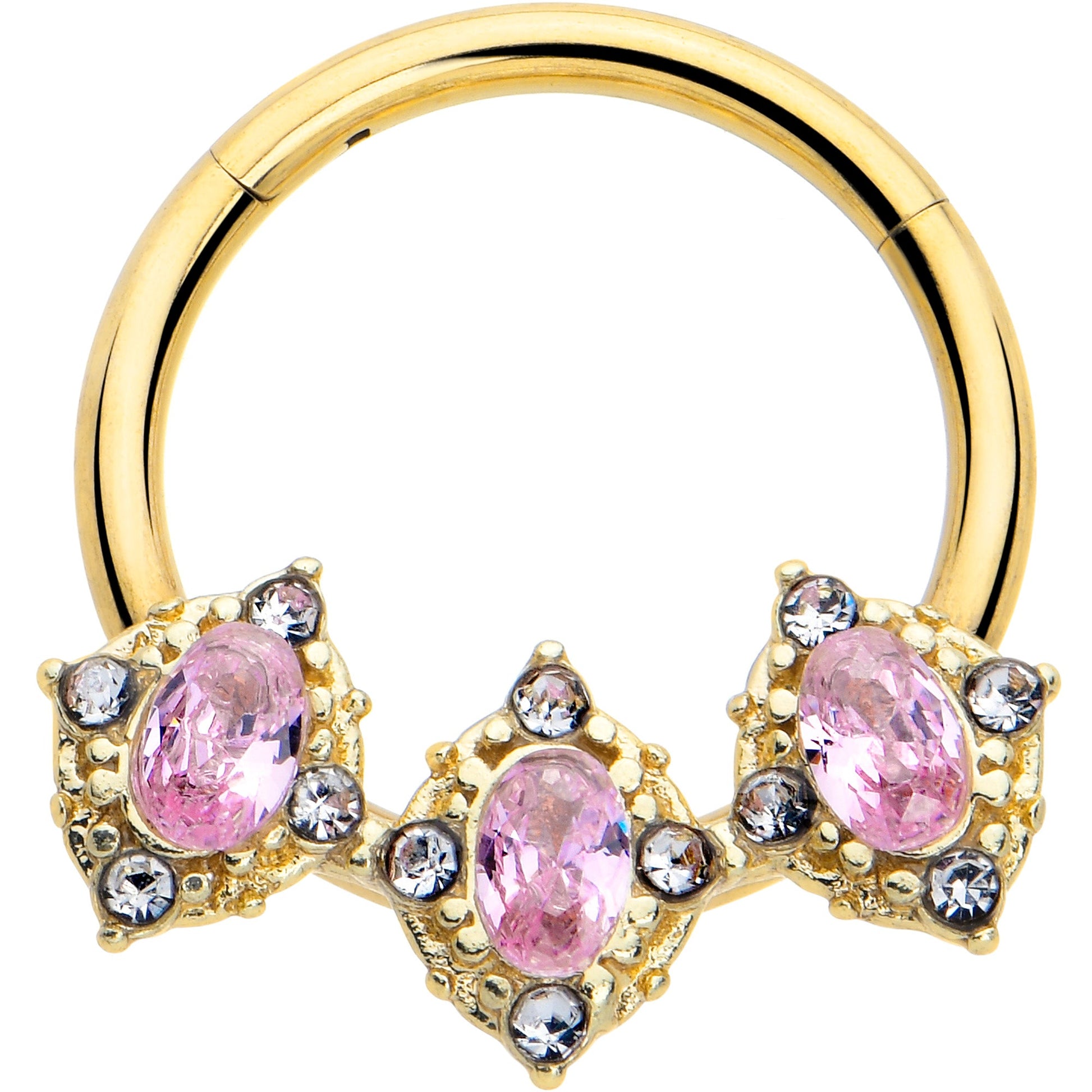 Gaze in wonder at this gorgeously elegant 16 gauge septum ring. It's made with a 10mm gold tone PVD over 316L surgical grade stainless steel hinged circular ring. The bottom curve features a trio of pink tourmaline oval charms. Around the ovals are elegant detailing, set with clear gems, in a minimalist filigree style. It also features a non-removable, hinged segment that makes insertion and removal a breeze and you can rock it in multiple piercings including tragus, helix, and some daith piercings. You'll wonder how you lived without this elegant cartilage piercing jewelry.