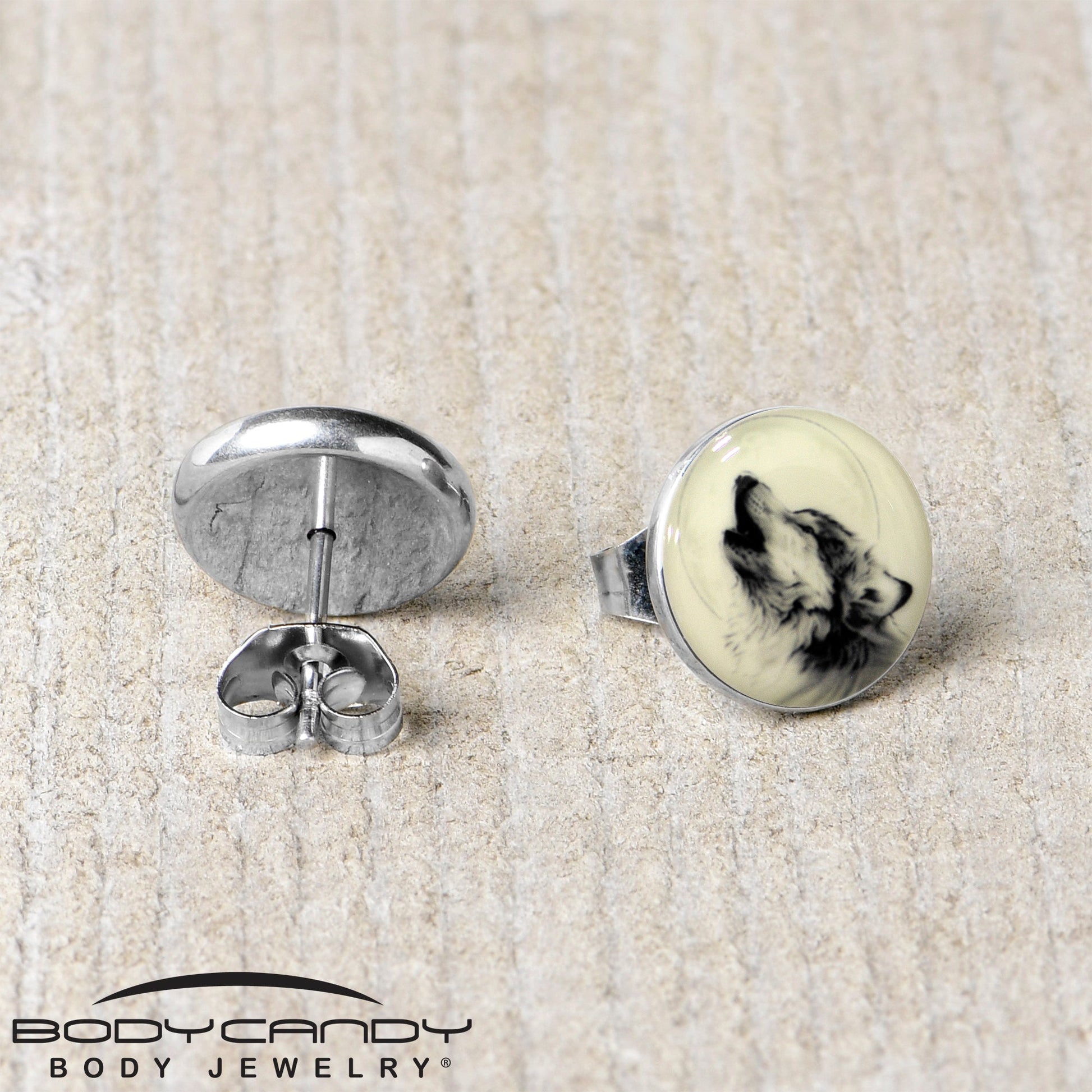 You will howl for this eye-catching wolf earrings. Stainless steel stud post earrings with logo inlay. Glow in the dark earrings will light up your night.