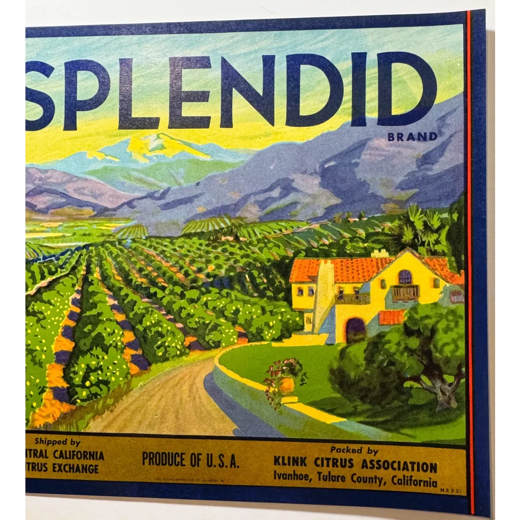 Hold onto your hats, folks! The Splendid Brand crate label burst onto the scene in September 1952, courtesy of the Western Litho Co. This vibrant lithograph is a feast for the eyes, featuring a captivating orchard scene that'll make you want to pack your bags for sunny California. Picture rolling foothills, a charming bungalow, and exquisitely detailed lemon branches, all crowned by the word "Splendid" in elegant serif lettering. This eye-catching design was engineered to stand out in bustling wholesale sheds and railway depots, its vivid greens and buttery yellows practically shouting "top-quality, sun-kissed lemons!" to eager buyers. Today, these original Splendid labels are more than just pretty pictures – they're treasured artifacts housed in prestigious collections like UC Riverside's Manuscript Collections. Ephemera enthusiasts can't get enough of their mid-century graphic pizzazz and the nostalgic glimpse they offer into Tulare County's citrus-packing glory days.