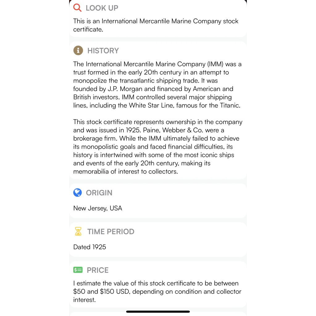 For the discerning collector, this stock certificate offers endless possibilities for research and discovery. Uncover the stories behind the signatures, delve into the company's fascinating history, and trace the ripple effects of the Titanic's fate through the annals of time. Each exploration adds another layer of value and meaning to this already priceless artifact.