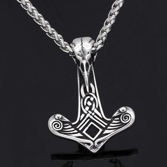 Vikings Mjolnir Raven Skull Stainless Steel Necklace
