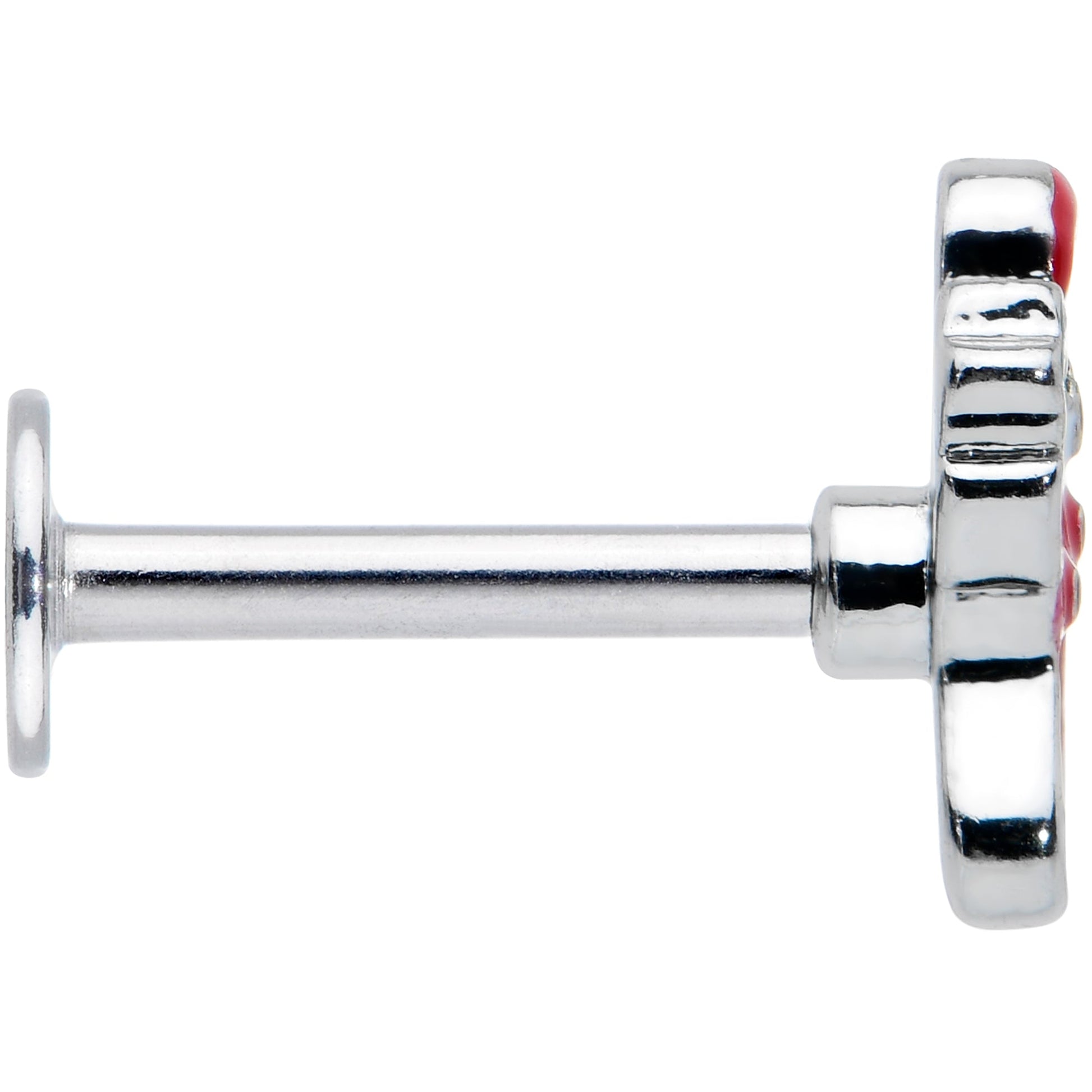 This stocking looks as happy as you'll be when you're rocking this 16 gauge lip ring! It's made with an 8mm durable 316L surgical grade stainless steel straight post with a flat disc end. It features a Christmas stocking charm, inlaid in red and green. The stocking features a candy cane and gift embellishments at the top and a tiny little face below the cuff. You can even rock it in multiple piercings including lip, monroe, tragus, helix, and some conch piercings. This stocking is sure to make you smile back when you're rocking this festive, holiday cartilage jewelry!Specifications