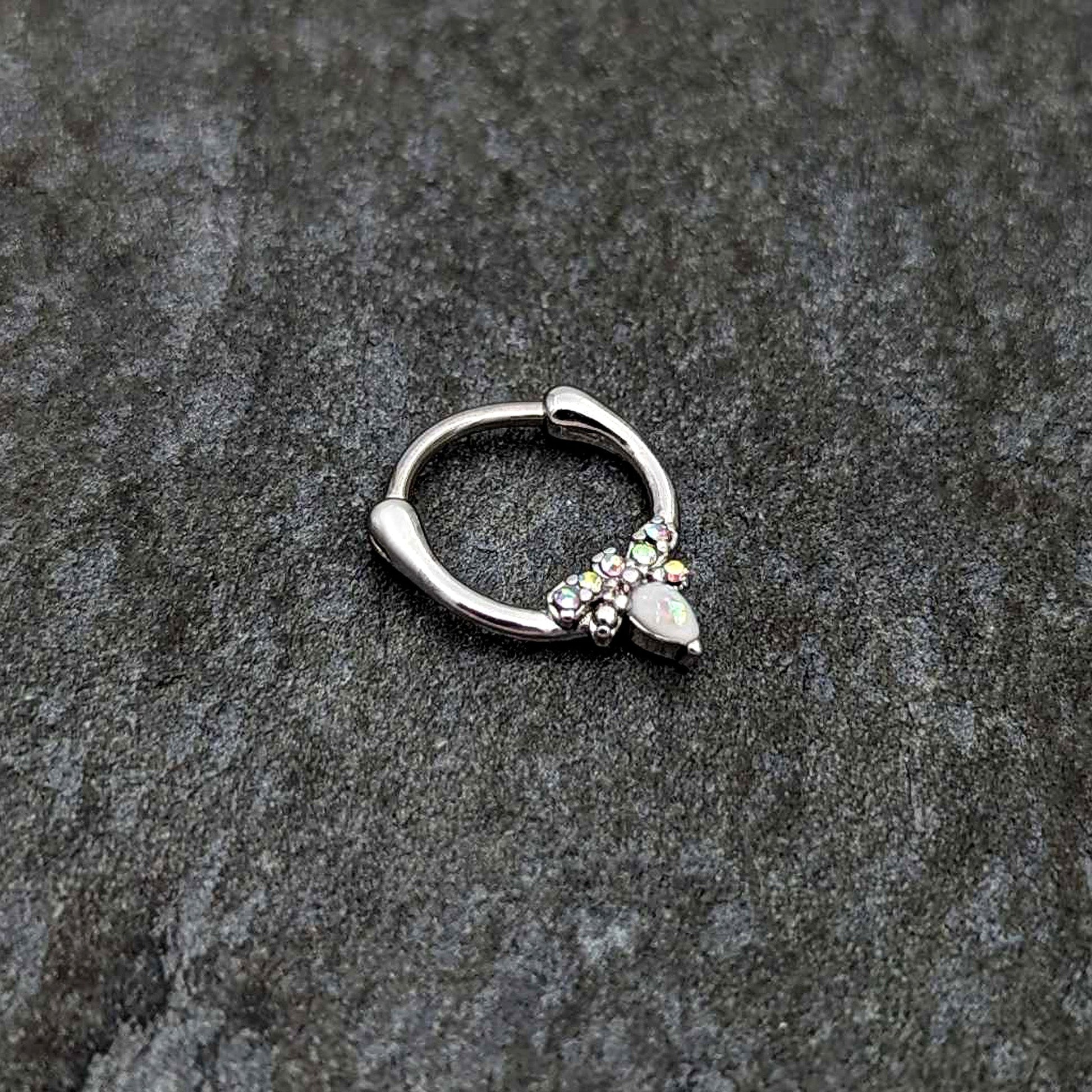 The gorgeous style of this 16 gauge septum ring is sure to have everyone buzzing! It's made with an 8mm durable 316L surgical grade stainless steel hinged curved barbell. It features a bee charm with the wings set with aurora gems and a white faux opal body for added eye-catching flair. The hinged clicker design makes it a snap to insert and remove and you can also rock this bee in multiple piercings including tragus, helix, and some daith piercings. This honey of a cartilage ring will make your piercings the sweetest in the hive!