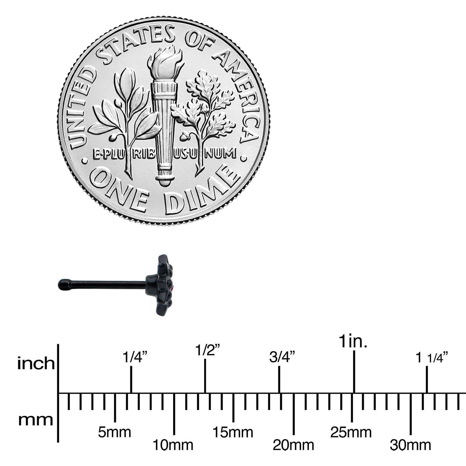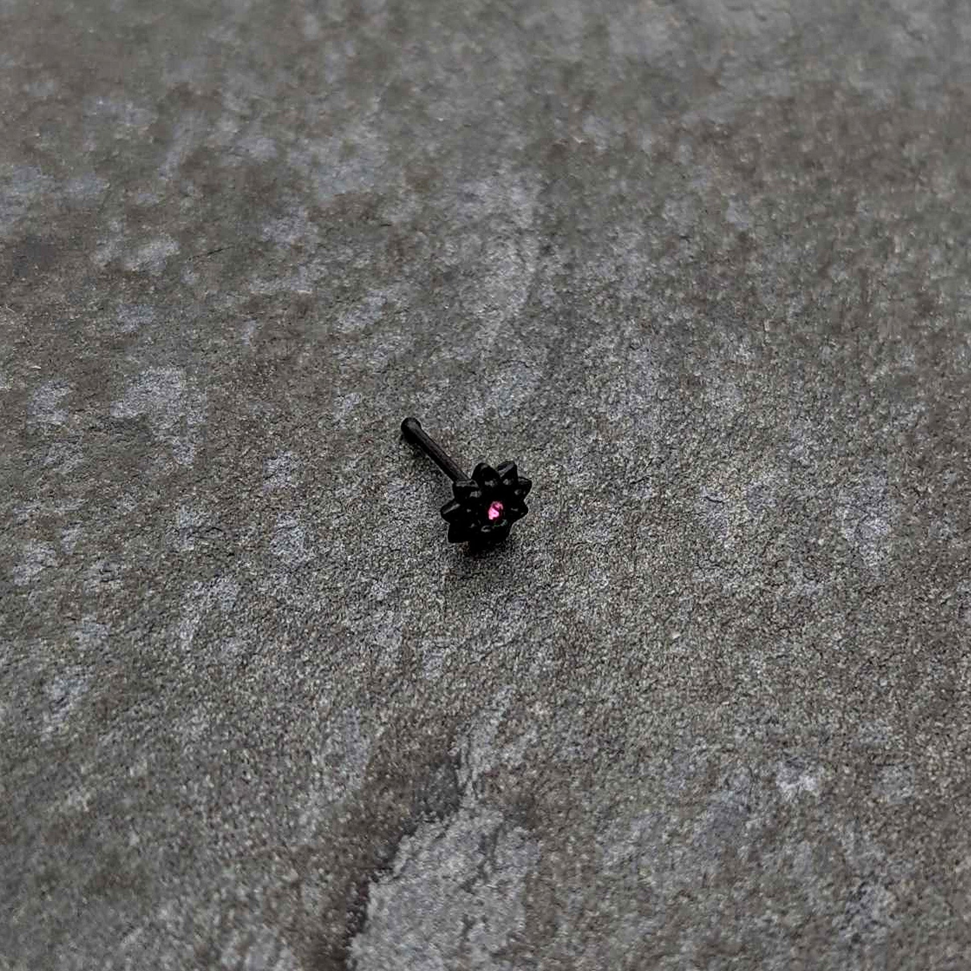 Go dark for Halloween, like this 20 gauge nostril ring! It's made with a 6mm black PVD over 316L surgical grade stainless steel straight post. It features a detailed flower, with petals in the deepest black. It's set at the center with a pink gem for stunning color contrast. Let your piercings bloom at night when you're rocking this striking starry flower nose piercing jewelry.Specifications