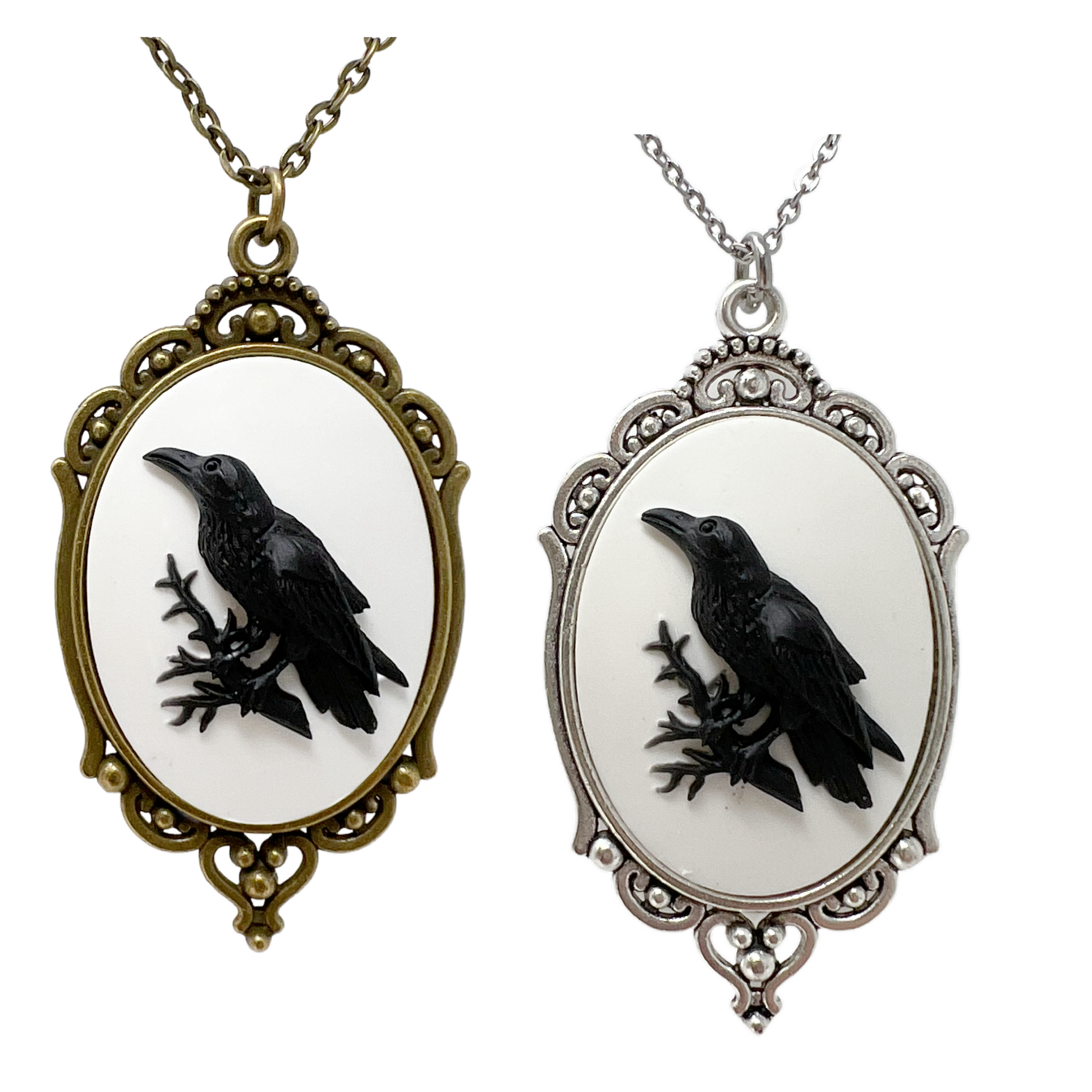 - Antique silver or bronze tone, goth style pendant setting is about 2" x 1-1/2" black raven over white cabochon