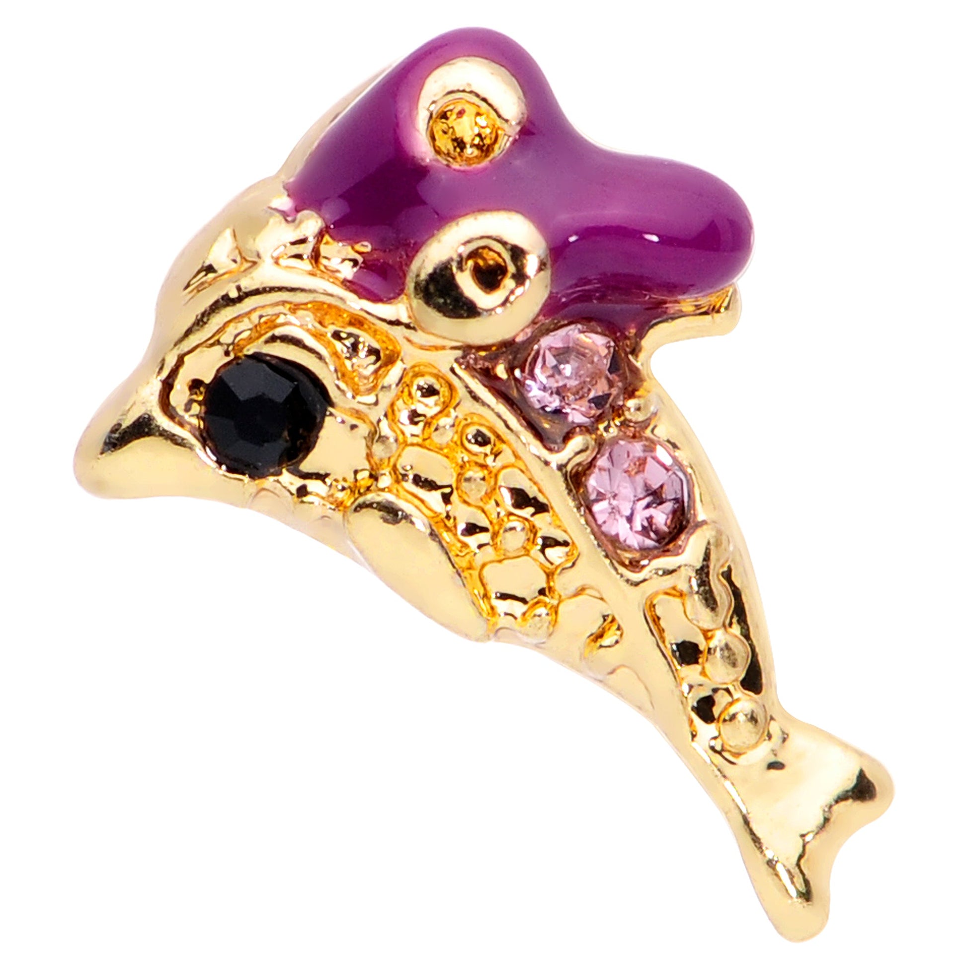 This dolphin is feeling extra pretty and you will too with this 16 gauge lip ring! It's made with an 8mm gold tone PVD over 316L surgical grade stainless steel straight barbell with a flat disc end. It features a leaping dolphin charm. It's set with light purple gems for an eye-catching look and the dolphin is wearing a purple bow for a cohesive and colorful appearance that you can rock in multiple piercings including lip, monroe, helix, tragus, and some conch piercings. You'll be feeling fabulous with this nifty, nautical cartilage jewelry!