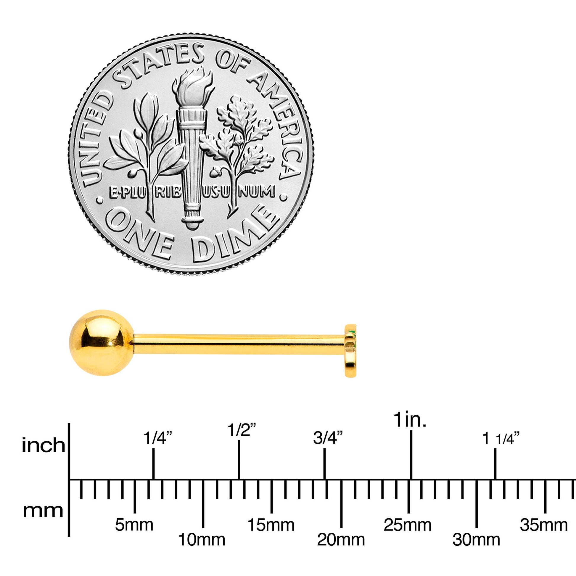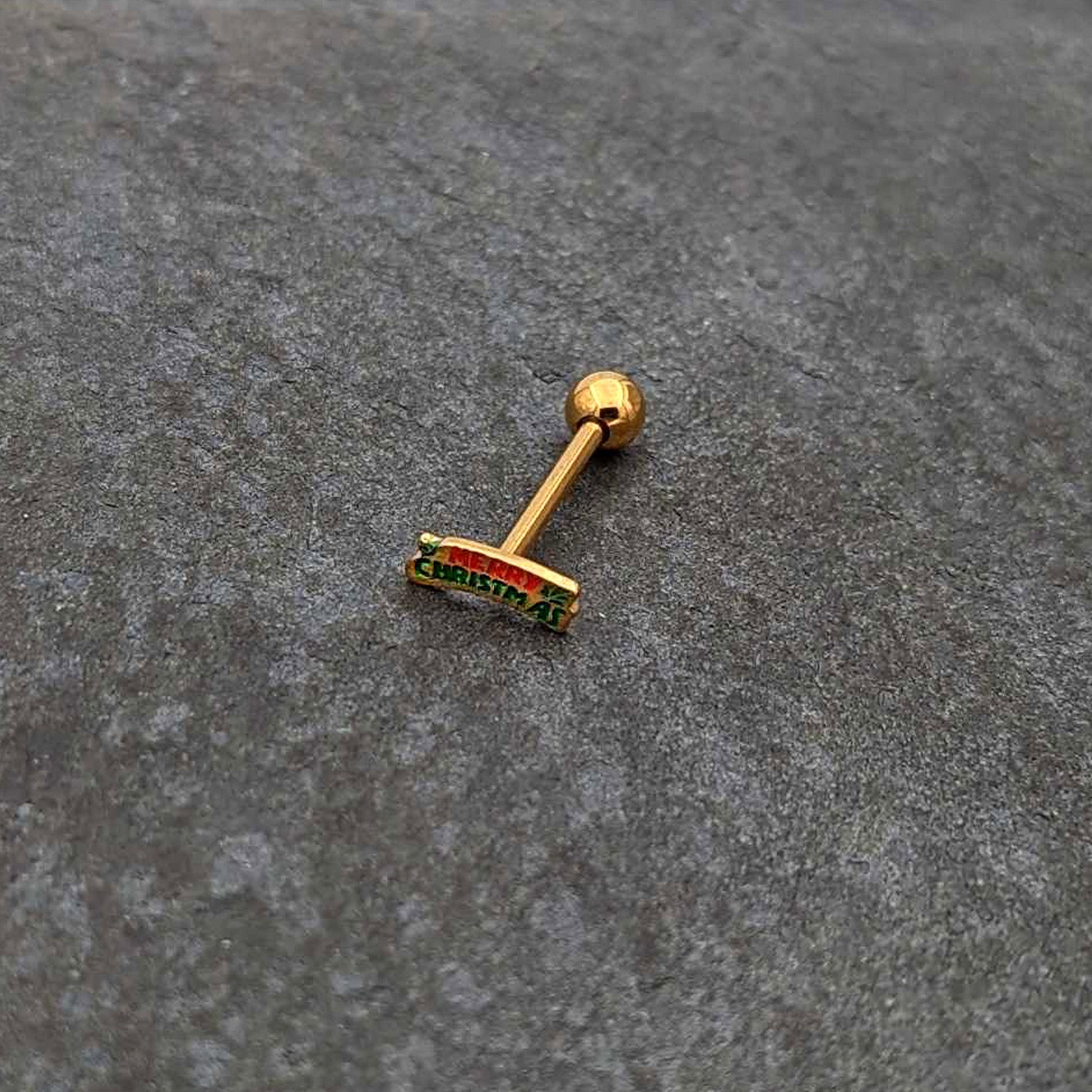 Keep the message simple with this 14 gauge tongue jewelry! It's made with a 5/8" gold tone PVD over 316L surgical grade stainless steel straight barbell with a 6mm bottom ball end. The top end features a Merry Christmas charm, with the words inlaid in festive red and green. The charm is rectangular for simple style you are sure to love. Get your message across with this word-perfect holiday tongue piercing ring!Specifications