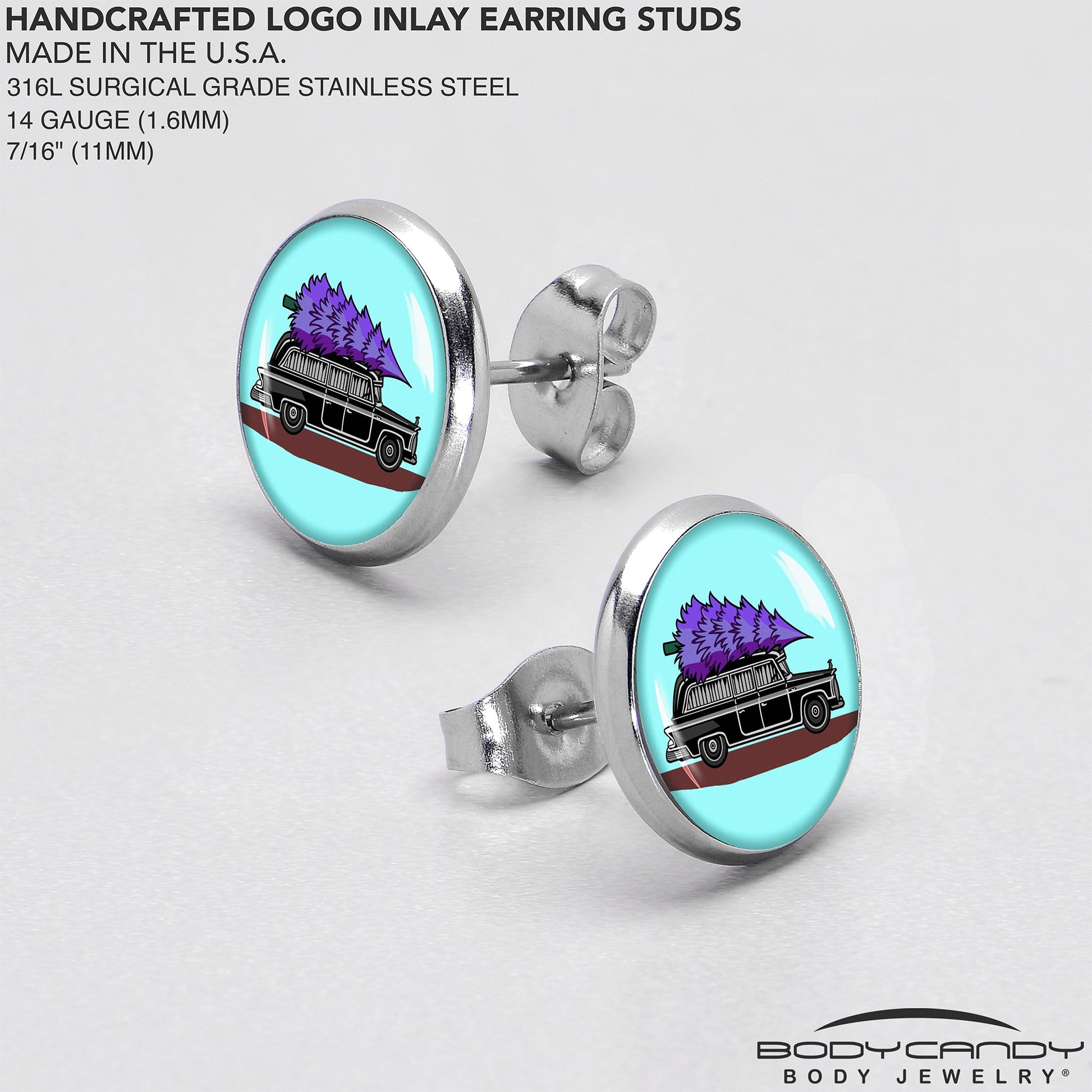 They definitely will not miss your drive by this holiday season with our Hearse Holiday Christmas Tree earrings. Attention, trendsetters! Prepare to be dazzled by our Stainless Steel Post with Friction Backs Stud Earrings, a masterpiece of elegance and creativity! This pair of steel earrings features a unique artist-drawn logo inlay design, meticulously crafted to add a touch of playful sophistication to your everyday look.