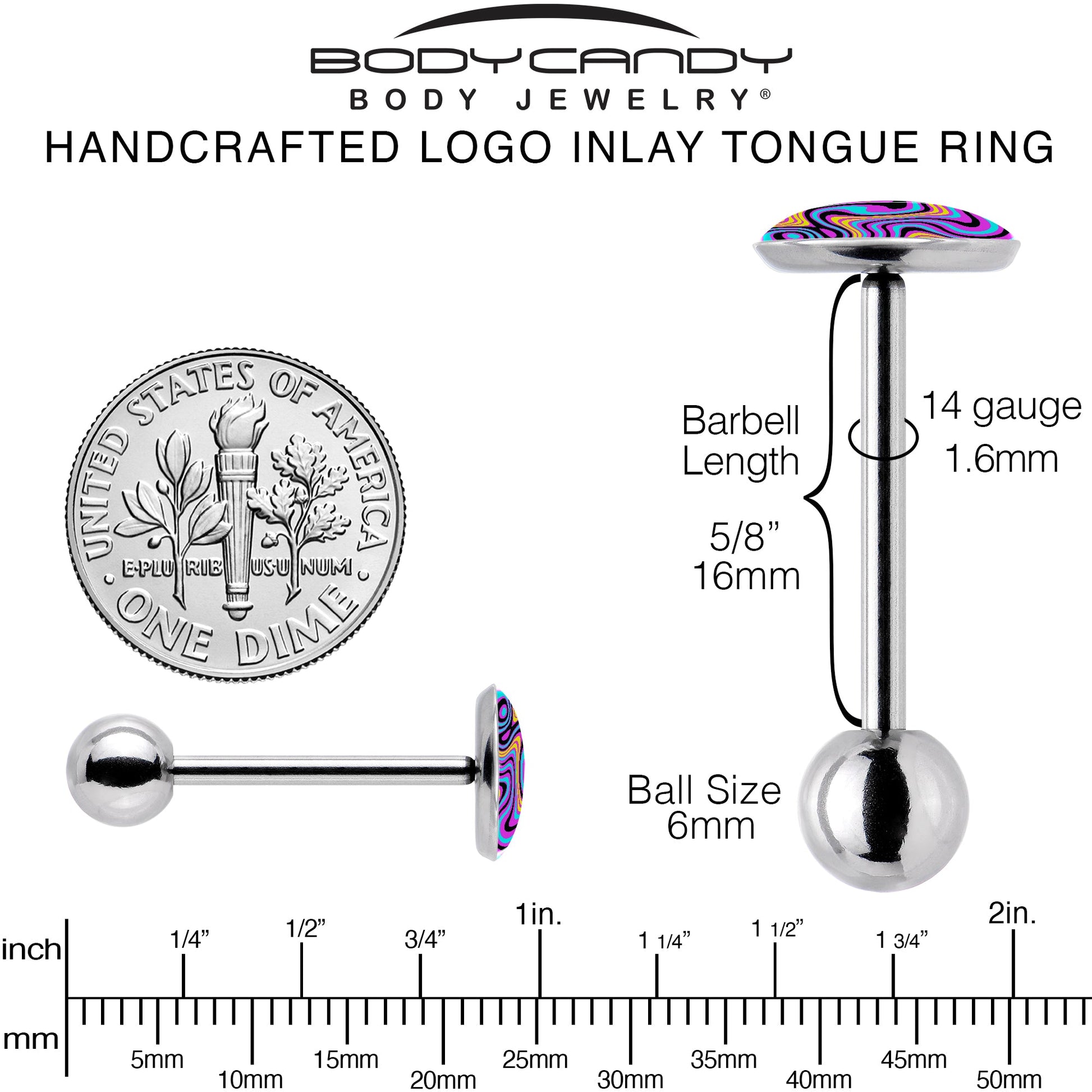 This artist hand-drawn vibrant funky swirl pattern 14 gauge tongue jewelry is the perfect blend of funky colors and a whimsical swirl pattern designed to bring a unique touch to your body piercing jewelry collection. Made from a 5/8 inch hypoallergenic 316L surgical grade stainless steel straight barbell, this tongue piercing ring ensures comfort for sensitive skin while maintaining a durable and long-lasting shine. The 6mm bottom ball end allows for easy insertion and removal, making it a practical addition to your jewelry box. Whether you're new to body piercings or adding to your collection, this tongue piercing jewelry is sure to stand out.