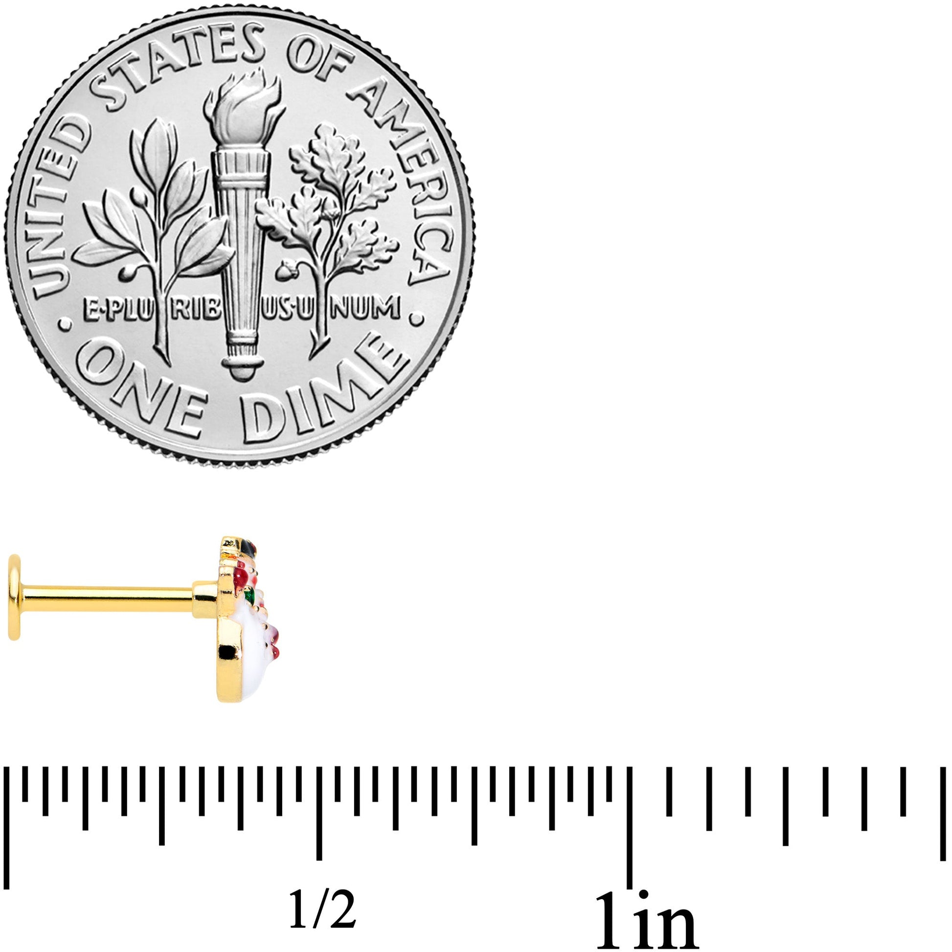 Give a hearty hello to everyone you see with this 16 gauge lip ring! It's made with an 8mm gold tone PVD over 316L surgical grade stainless steel straight barbell with a flat disc end. It features a white snowman charm. The snowman is embellished with colorful red mittens and green scarf, as well as a traditional black hat. You can even rock this friendly fellow in multiple piercings including lip, monroe, tragus, helix, and some conch piercings. Say hello to winter with this fabulous, friendly snowman cartilage jewelry!Specifications