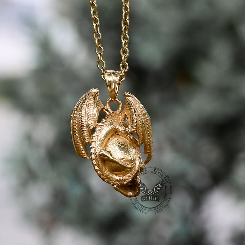 The design of this pendant is a combination of dragon and skull, which creates a look that is evil and glamorous. The dragon is a symbol of the beast par excellence, the adversary, and the devil. In most traditions, it is the embodiment of chaos and untamed nature. It is associated with the depths of the unknown sea, with the mountaintops, and with the clouds. As a well-known element, the skull symbolizes death, reminder, equality, and so on.
