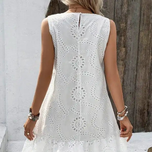 Ladies' Solid Color Vacation Style Hollow Flower Pattern Details Round Neck Off Shoulder Wide Shoulder Strap Mushroom Edge Hanging Pleat Elegant Style Dress