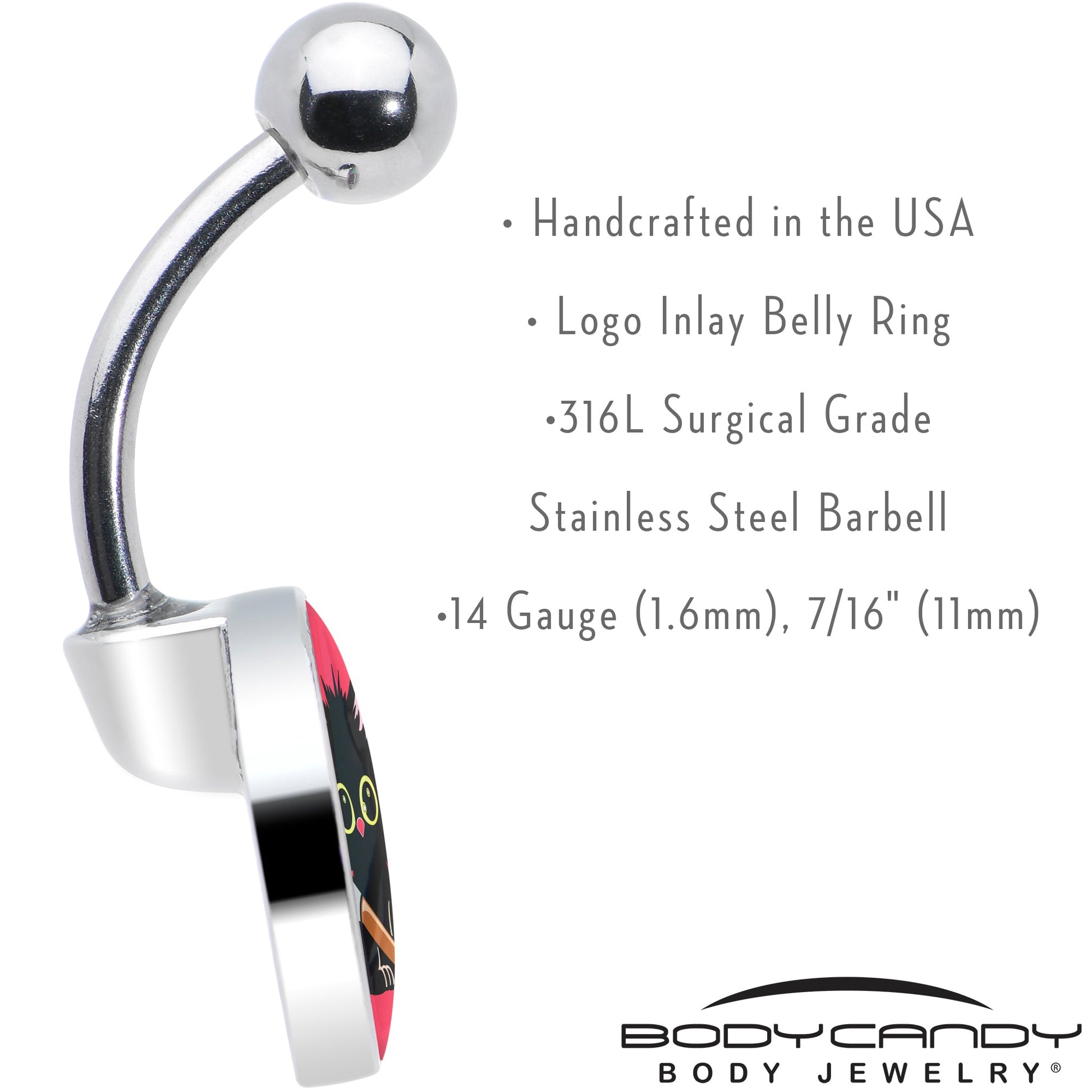 Make a statement with this durable 316L Surgical Steel belly button ring. This 14 gauge navel belly piercing ring is your ticket to standing out from the crowd. Don't just wear jewelry; wear art that tells a story ? your story. Get mad style when you are rocking this stabby cat navel piercing jewelry.