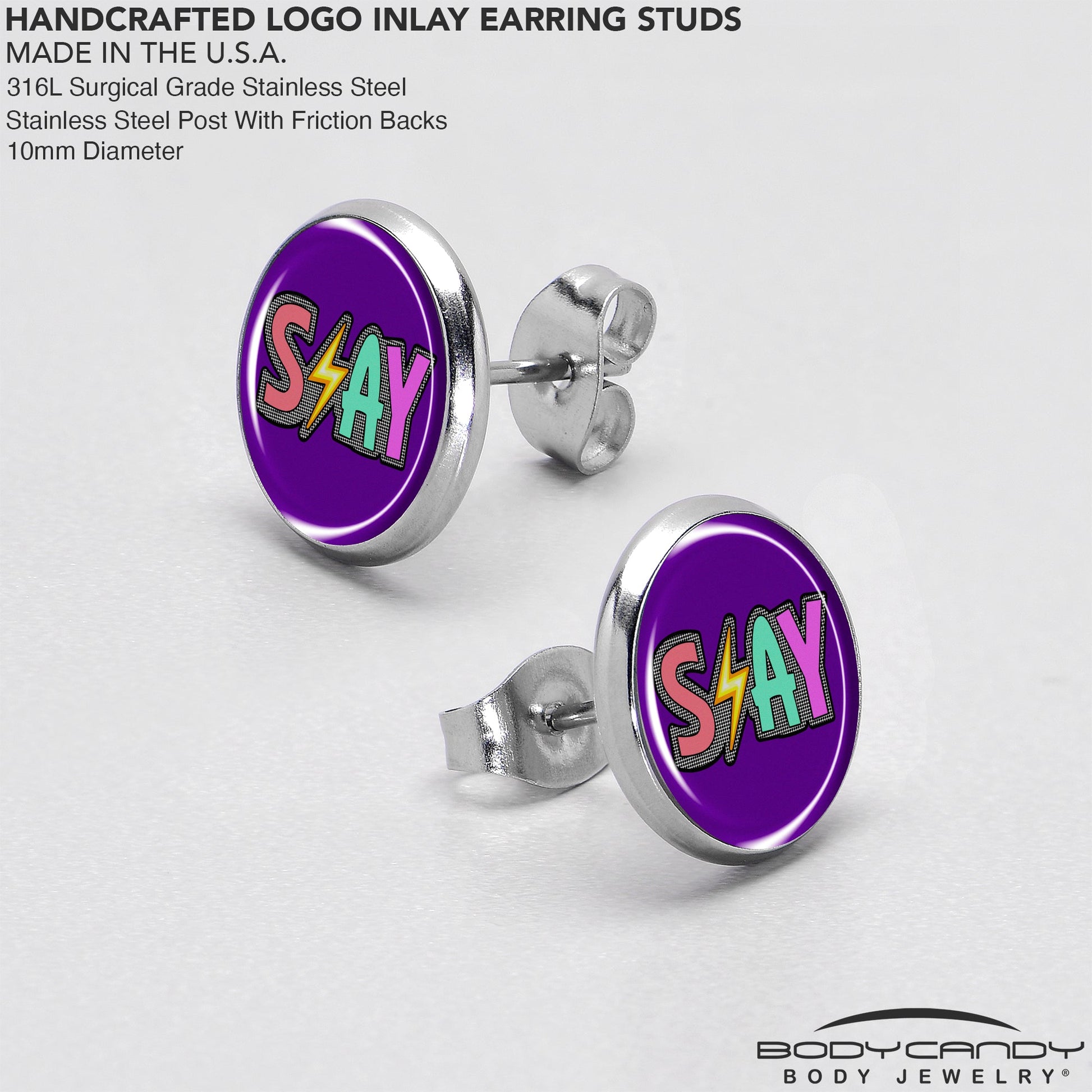 Get ready to kill em with style when you're rocking these stud earrings for pierced lobes. They're made with stainless steel straight posts with friction backs for a secure fit. Each one features a purple logo disc charm with the word Slay on it. The letters are red, green, and purple and the L is composed of a yellow lightning bolt, giving the overall look of seriously colorful rocker style. Get a look that will slay for sure with these sassy pierced earrings. Sold as a set of two.
