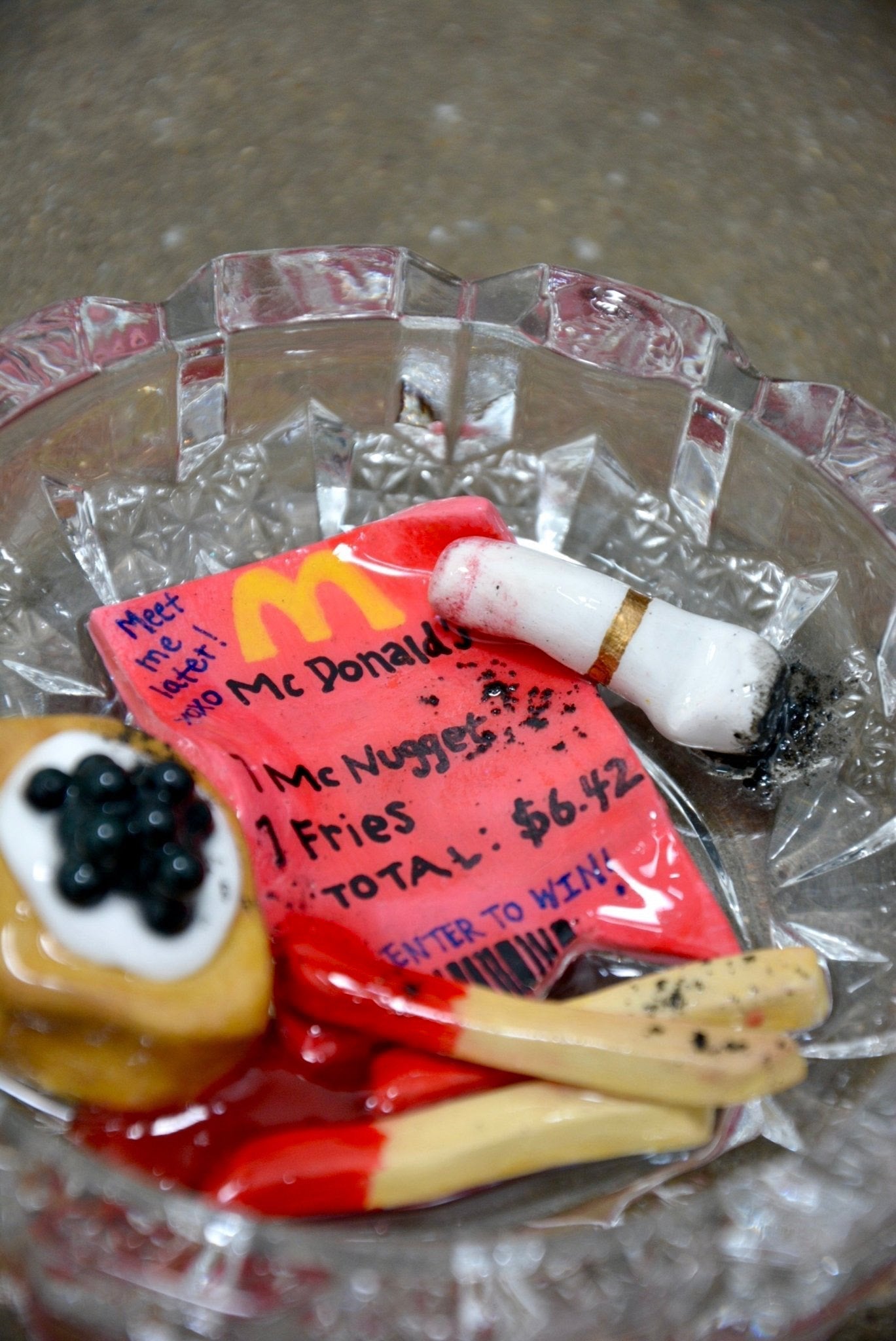McMillionaire… Cuz everyone loves a good dollop of crème fraîche & caviar on a Mickey D nuggie! Featuring hand-rolled caviar “pearls”, french fries dipped in ketchup, a “ripped” receipt with a cheeky love note scribbled on, and a crinkled cigarette butt with lipstick stains.