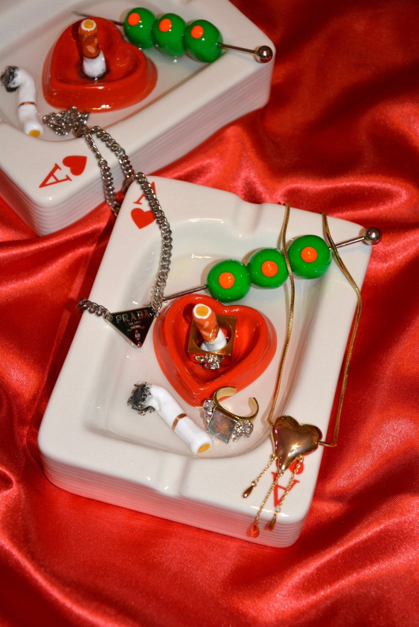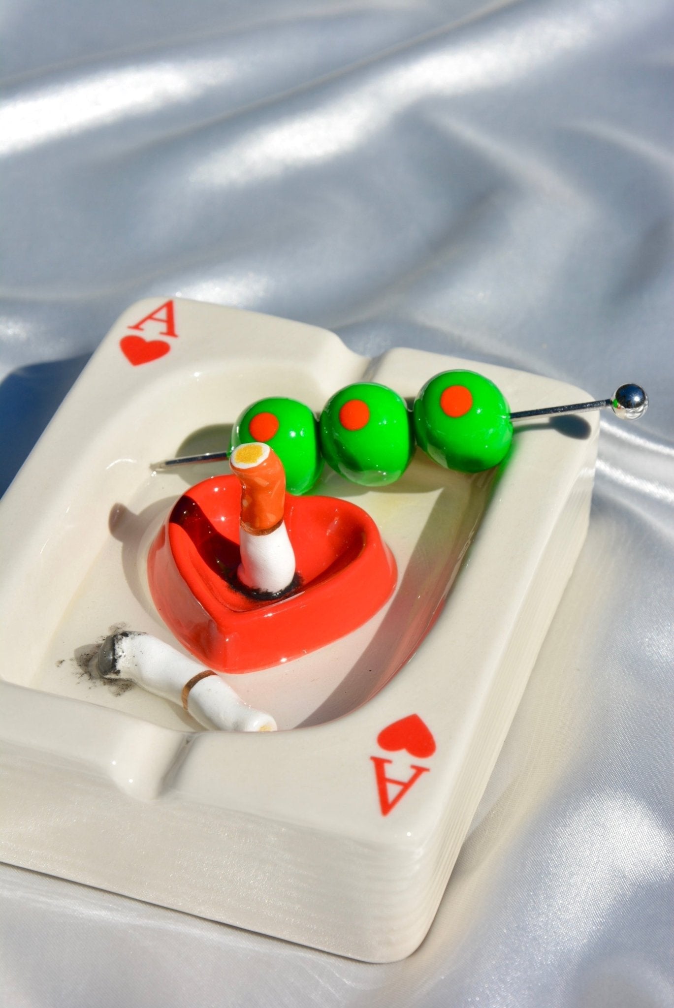 Featuring a dirty martini pick, cig butts, and that “free drink while you spiral” vibe, this ashtray is basically: I won $200 then immediately lost my dignity. Grimy, chaotic, lucky-but-cursed… It gives neon, dusty, “ATM inside,” carpet smells illegal energy.