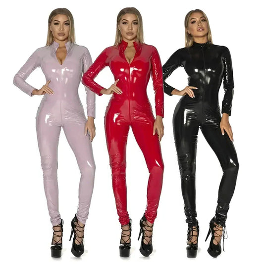 HELLZIRRA Liquid Vice Goddess Bodysuit – Spicy Front-Zip PVC Latex Jumpsuit w/ Elastic Grip Fit + Power Stance Appeal