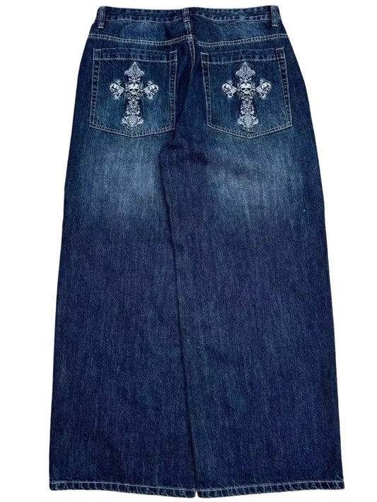 Crossfade Chaos: Y2K Vintage Wash Wide-Leg Punk Jeans with Cross Embroidery & Street Authority