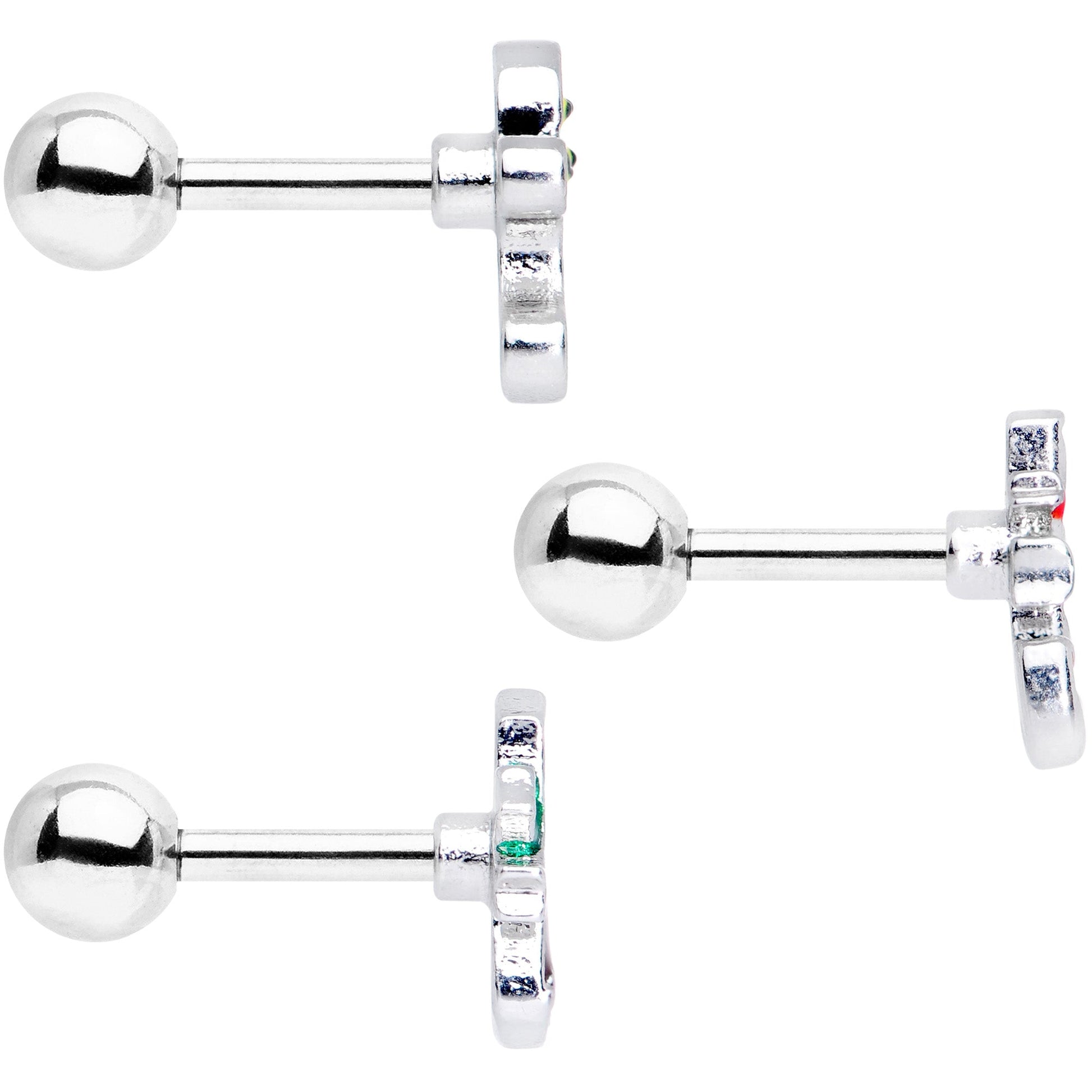 If you love to decorate for the holidays then you will love decorating your cartilage piercings with this pretty set of 16 gauge helix jewelry! Made with 6mm durable 316L surgical grade stainless steel straight barbells, this set of tragus studs features a yellow gingerbread cookie charm, a red and green Christmas bell charm, and a red candy cane charm with a red bow too! This cartilage jewelry can be worn in multiple piercings including the helix, tragus, conch, and more. Sold as a set of three.