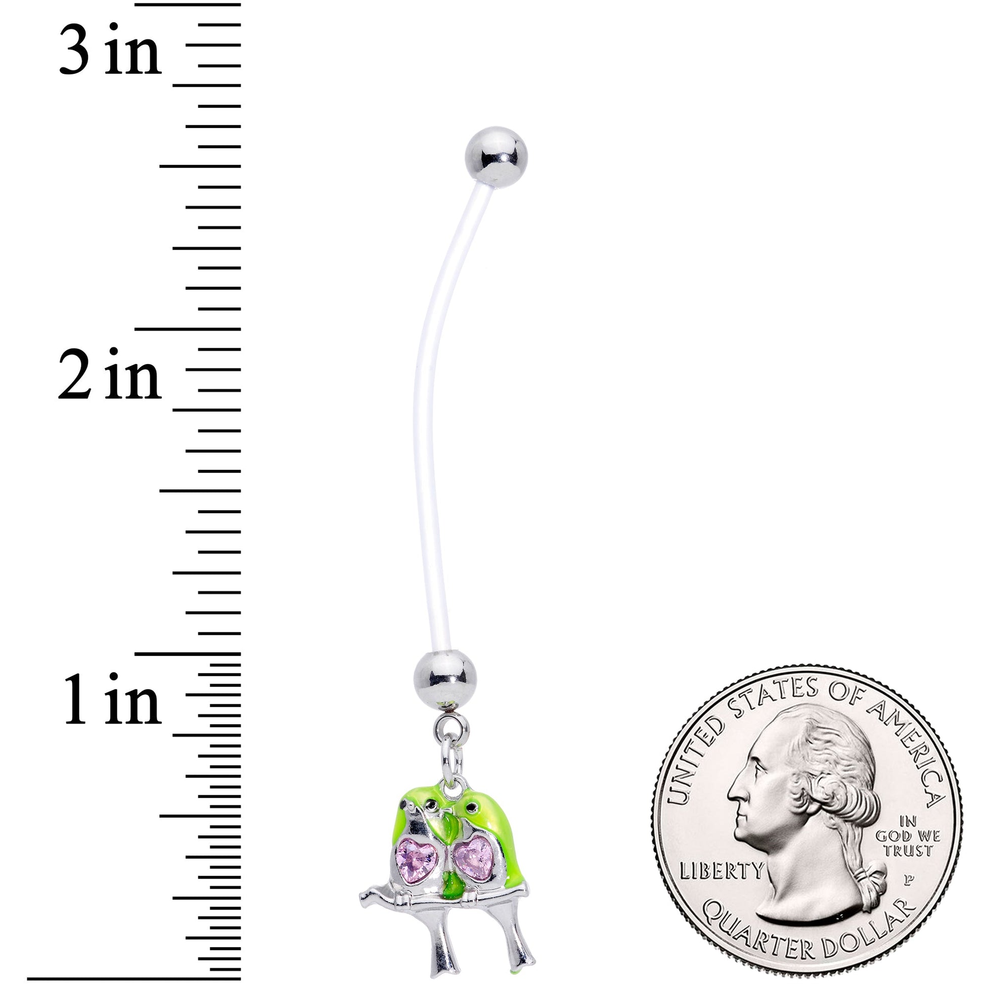 These little lovebirds are as close as can be....but not quite as close as mom and her baby! This 14 gauge navel ring is made with a 1 1/2" clear Bioflex straight barbell with 5mm stainless steel ball ends. It features a dangle of two green lovebirds, nestled together on a perch that could signify mother and child or the arrival of twins too! The birds are embellished with black eyes and have large heart-shaped pink gems on their bellies. The flexible Bioflex barbell is self-threading and can be trimmed to a perfect fit. Simply cut where needed and reattach the ball end for a fit that's custom to your changing body. There's all kinds of reasons to love these lovebirds!Specifications