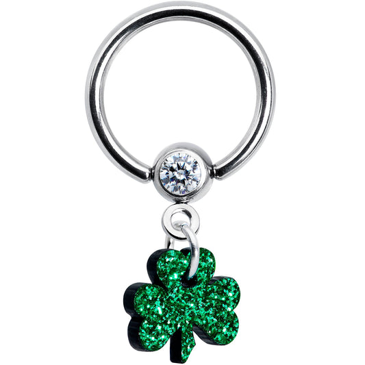 14G 5/8 Green Glitter Shamrock Chain Dangle Nipple Ring Set